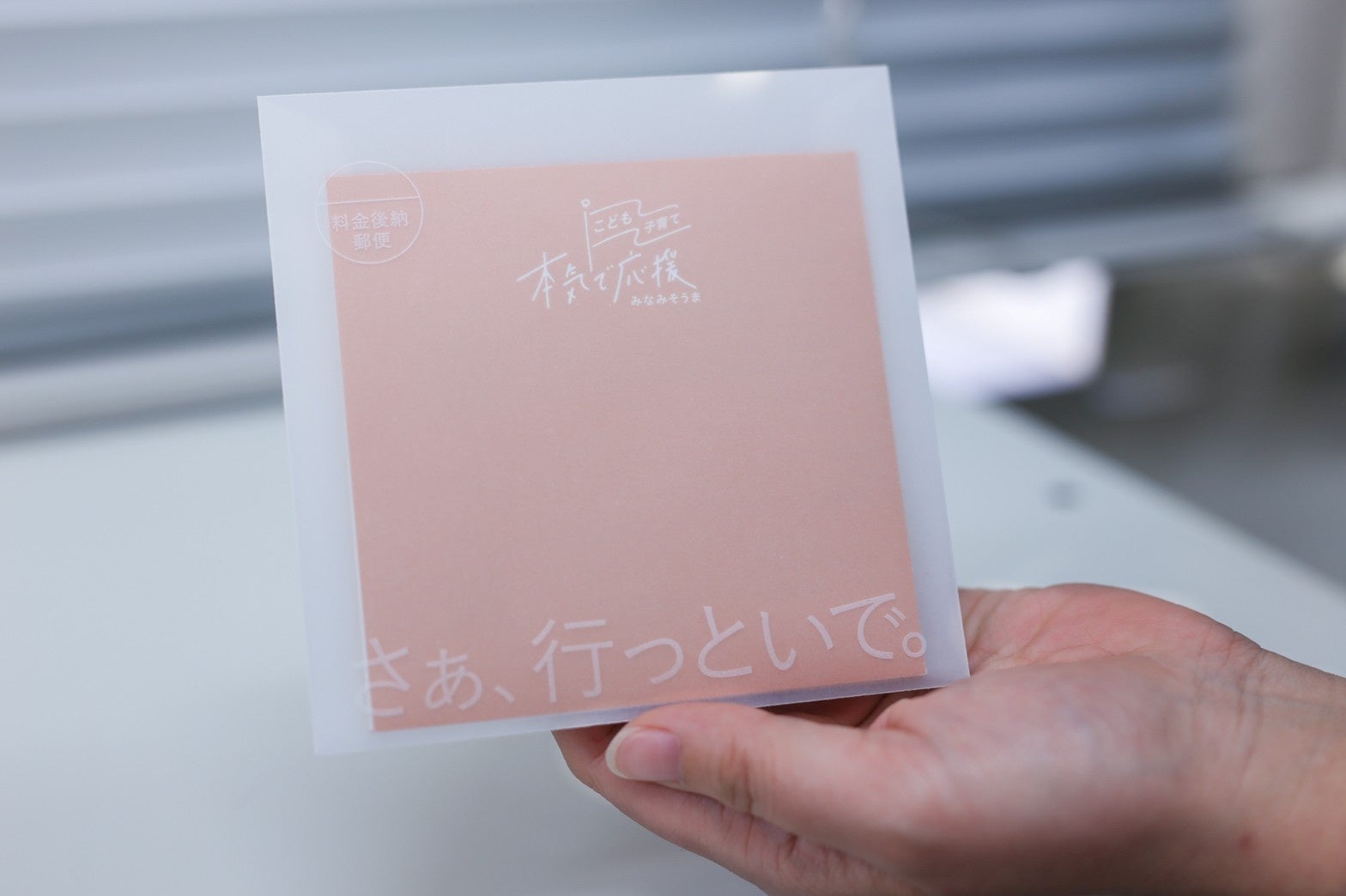 18歳を応援する気持ちを伝えるにも、まずは封筒を手に取ってもらうため、長方形の落ち着いた色の”いつもの 封筒”ではなく、イベントの招待状のような、非日常感・ワクワク感があるトレーシングペーパーでできた半透明 の封筒を選定しました。