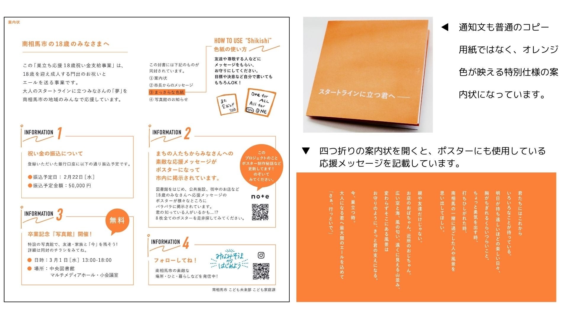 封筒のコンパクトなサイズに合わせて、案内状や応援メッセージについても読んでもらいたいことをコンパクト にまとめて記載しました。