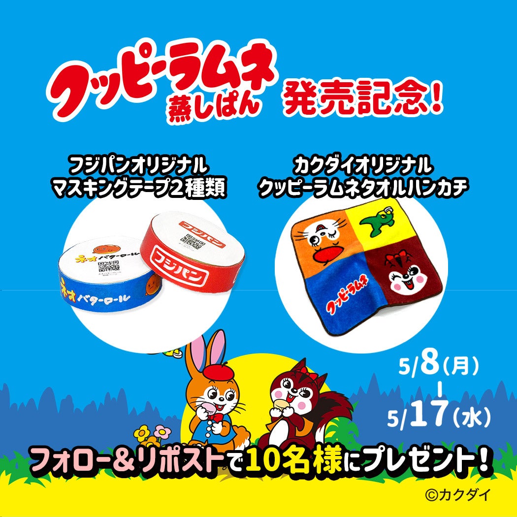 2023年5月8日~5月17日の期間、フジパン公式インスタグラムにおいてキャンペーンを実施します。フジパンアカウントをフォローし、「#クッピーラムネ蒸しぱん」を付けた投稿をリポストすると抽選で10名様にフジパンオリジナルマスキングテープ(2種)とカクダイ製菓オリジナルタオルハンカチをプレゼント。ハッシュタグを付けて商品画像を投稿すると当選確率UPのチャンス。