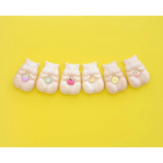 ミックスジュース餡バージョンのハムスターに持たせるものは、フルーツの形の砂糖菓子です。