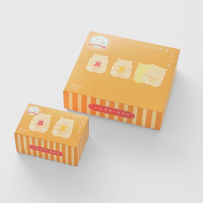 (月)より全国で発売されます。6個セットと2個セットの2種類あり、ご自身でモナカに餡を詰めてお楽しみいただけます。大阪の味をイメージしたトロピカルな香りのミックスジュース餡と、パリッと香ばしいモナカがなんとも言えないハーモニーで、見た目だけでなく美味しさにもしっかりこだわった商品です。ハムスターのおなか部分が少しくぼんでおり、付属のフルーツの形をした砂糖菓子を置くと、まるでハムスターがフルーツを持っているように見えます。手土産やギフトにもぴったりなレトロ風パッケージです。商品は全国の店舗とオンラインでお買い求めいただけます。
