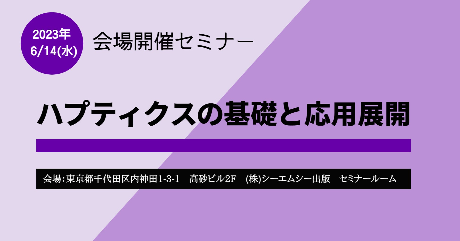 化学・電子工学などの技術・市場動向レポート発行やセミナー開催を行う、株式会社シーエムシー出版(本社:東京都千代田区、代表:辻賢司)は、6月14日(水)13:20~16:40に「ハプティクスの基礎と応用展開」セミナーを開催します。新型コロナウイルス感染症の5類移行に伴い、2023年5月から東京都内を中心に会場を設け、産業技術セミナーを開催します。