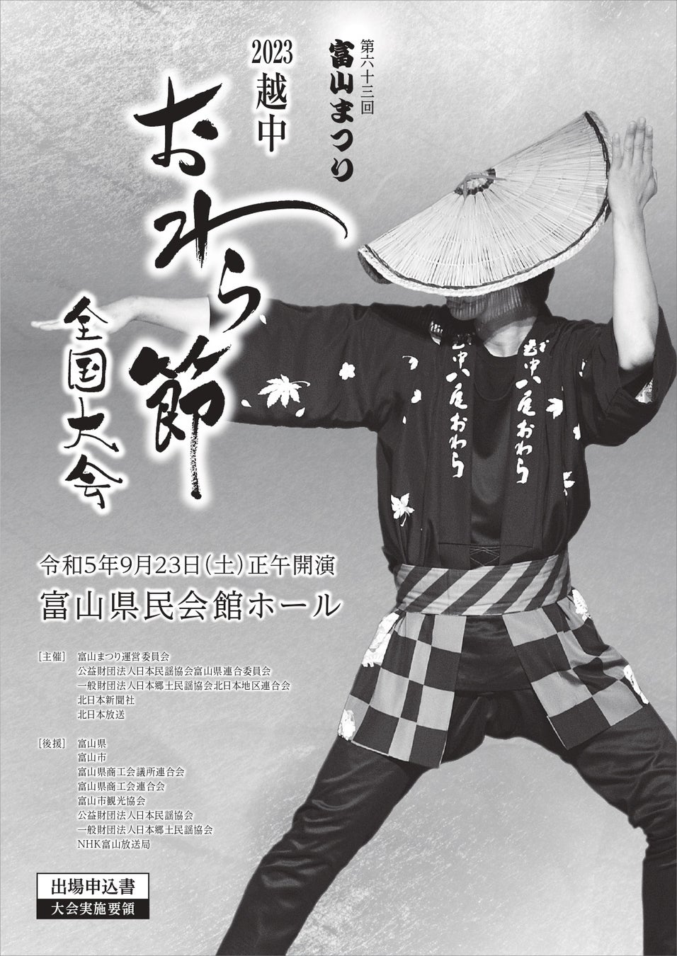 富山県を代表する民謡、越中おわら節の全国一を競うのど自慢コンクール「2023越中おわら節全国大会」が9月23日、富山県民会館で開かれます。8月31日まで出場者を募集中。当大会は、県内外からも参加を受けており、多くの民謡ファンに親しまれています。今年も全国から多くの参加と観覧をお待ちしております。
