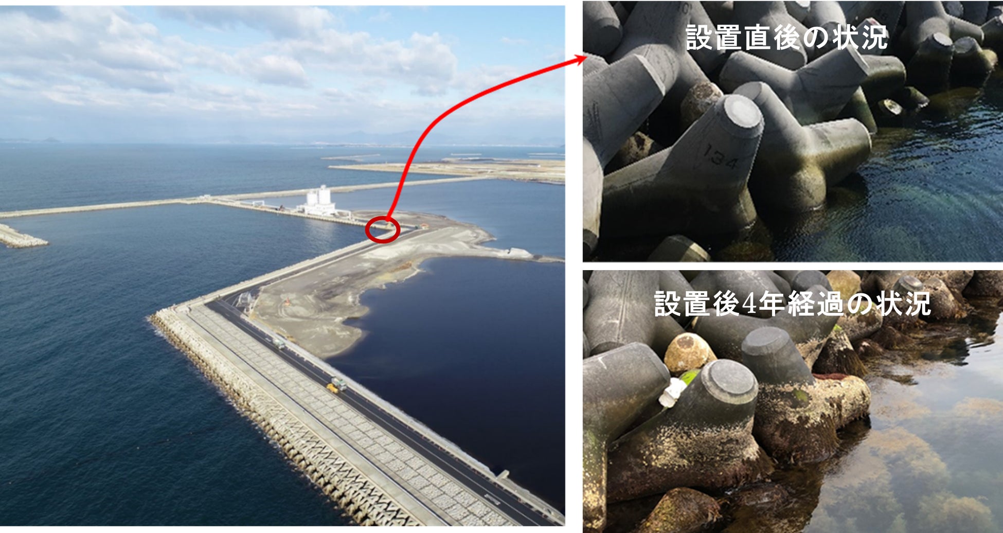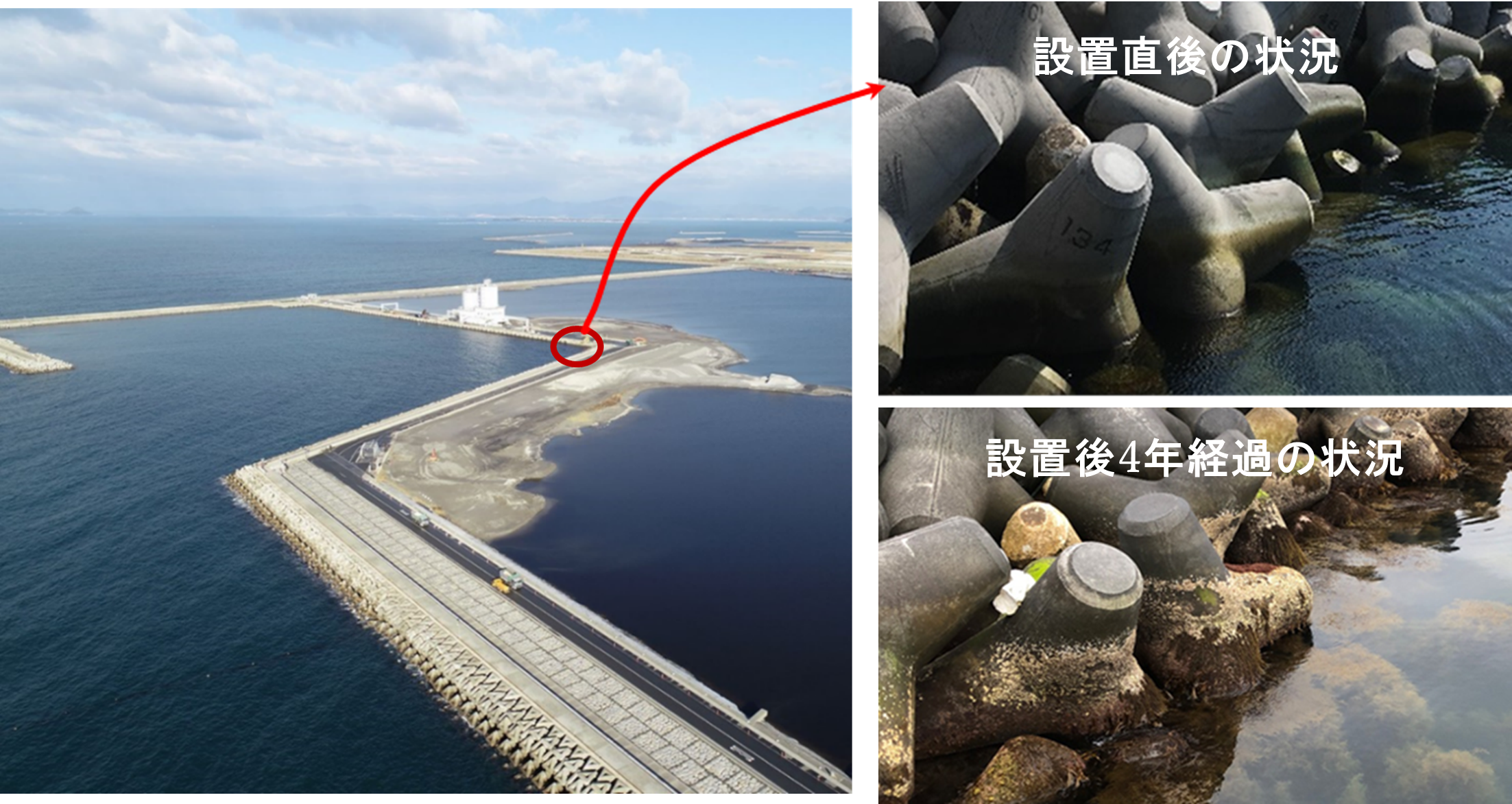 Jパワーでは、茅ヶ崎研究所が北九州市にある若松総合事業所の構内で、Jブルーコンクリート(産業副産物を多量に活用した低炭素素材)を用いた消波ブロックでのブルーインフラ※3整備を実施中です(右写真参照)。同ブロックに付着した海藻が吸収するCO2をJブルークレジットとして継続的に認証を受けています。ブルーインフラを補修工事等で積極的に用いること、またその結果繁茂した海藻類由来のJブルークレジットを活用してCO2オフセットを行うことで、2021年2月に掲げた「J-POWER"BLUE MISSION 2050"」におけるカーボンニュートラルの実現に向けて、今後も継続的に脱炭素と地域共生との両立を実現する活動に積極的に取り組んでいきます。