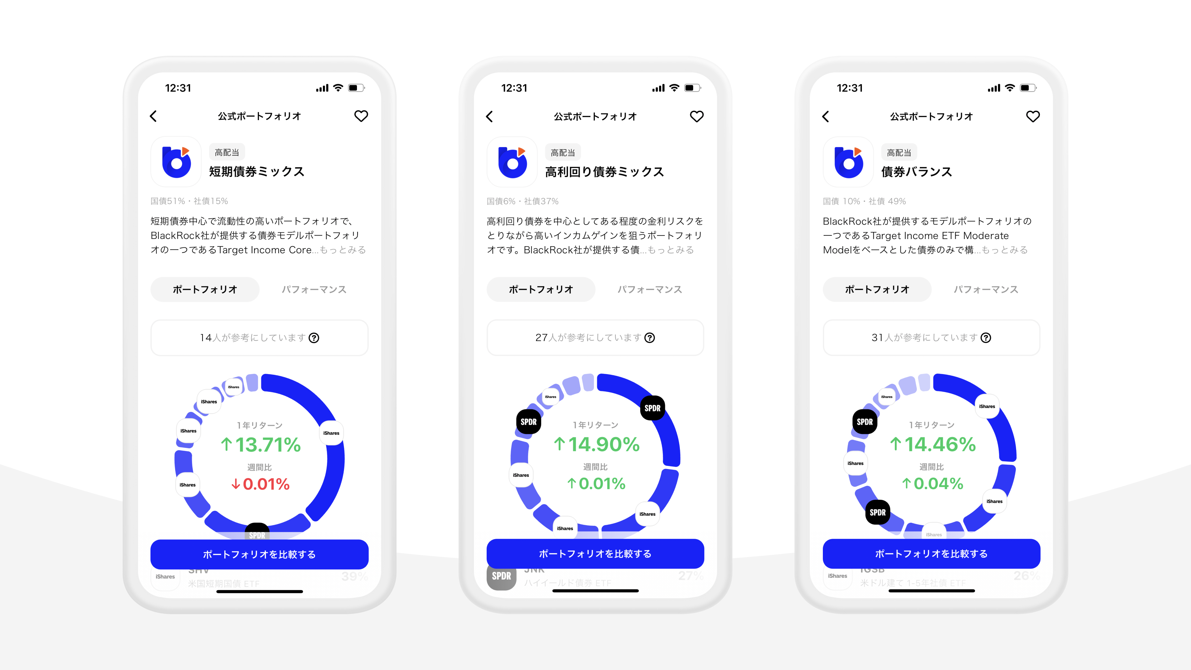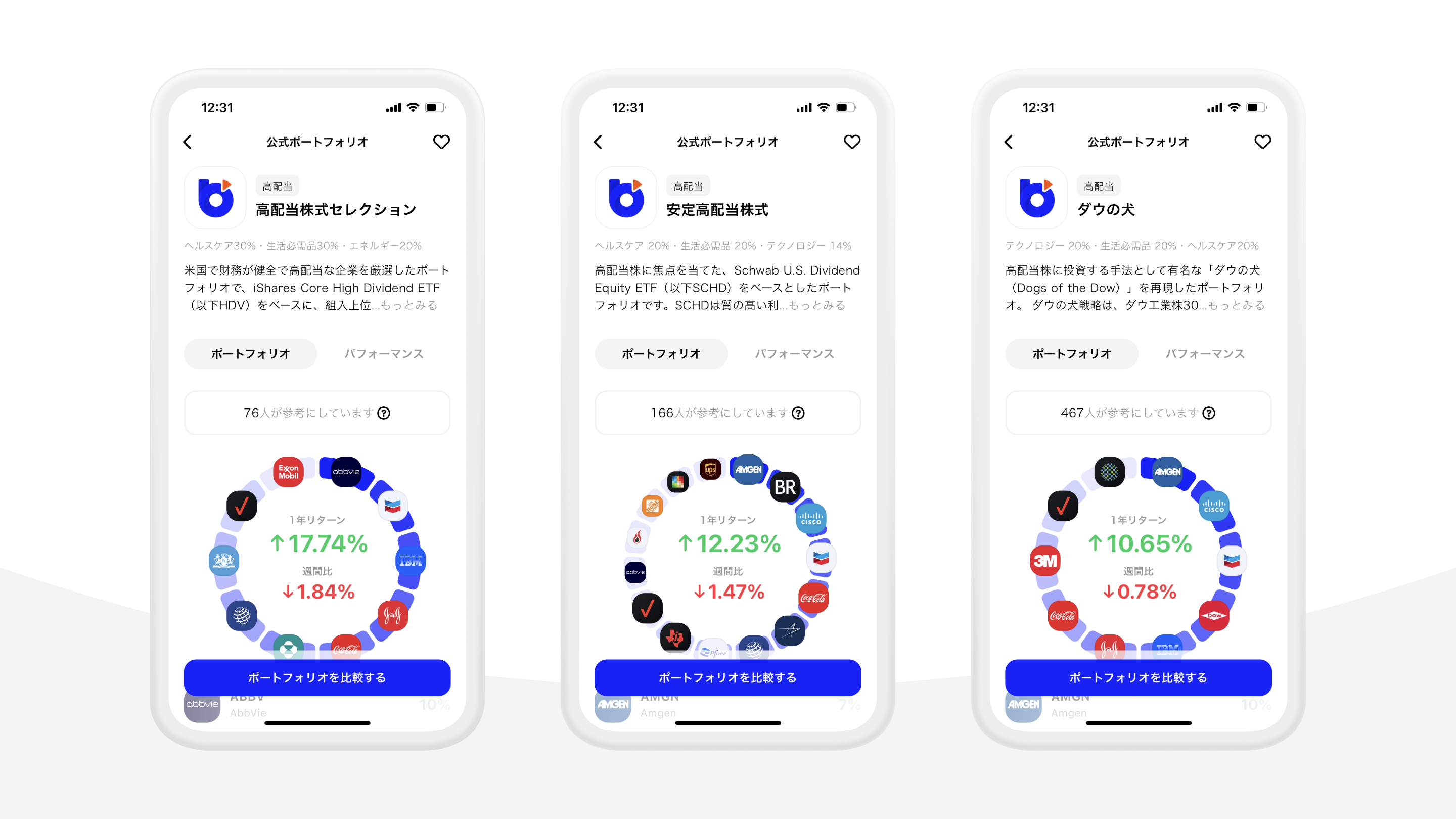 他の投資家のポートフォリオを真似できる機能です。専門家や他のユーザーがどんなポートフォリオで投資をしているか見て、気に入ったポートフォリオをワンタップでコピーでき、そのまま投資を始められます。コピーしてから自分で銘柄を変更したり、アレンジすることも可能です。