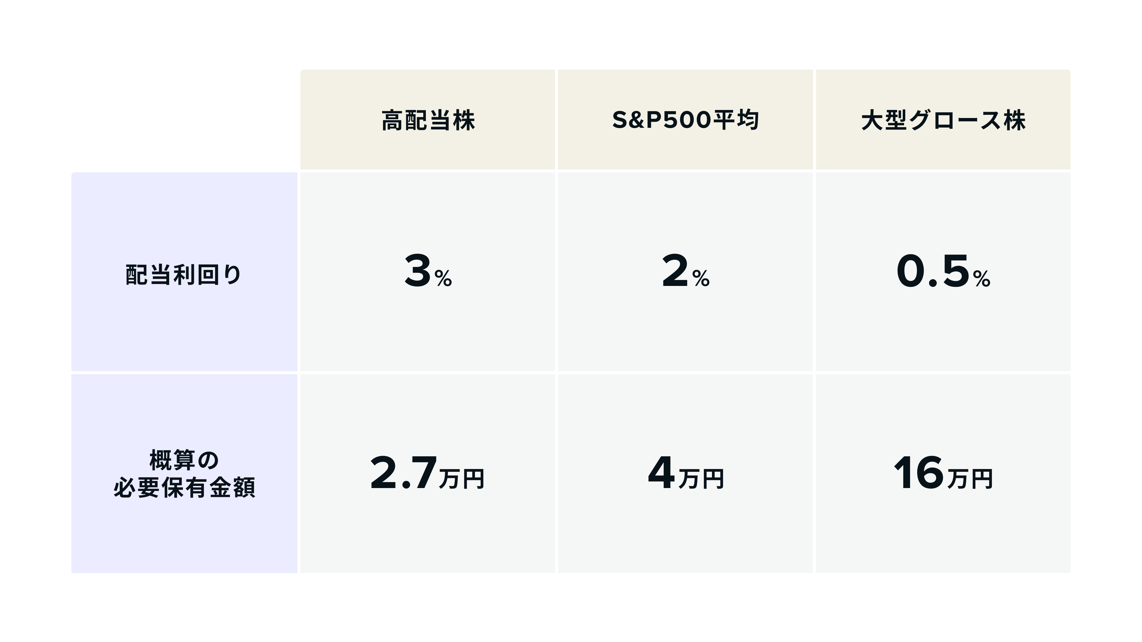 注)四半期に一度配当があると仮定し、都度の配当支払いが200円を超える水準となるためには、どの程度の銘柄保有金額が必要かを概算