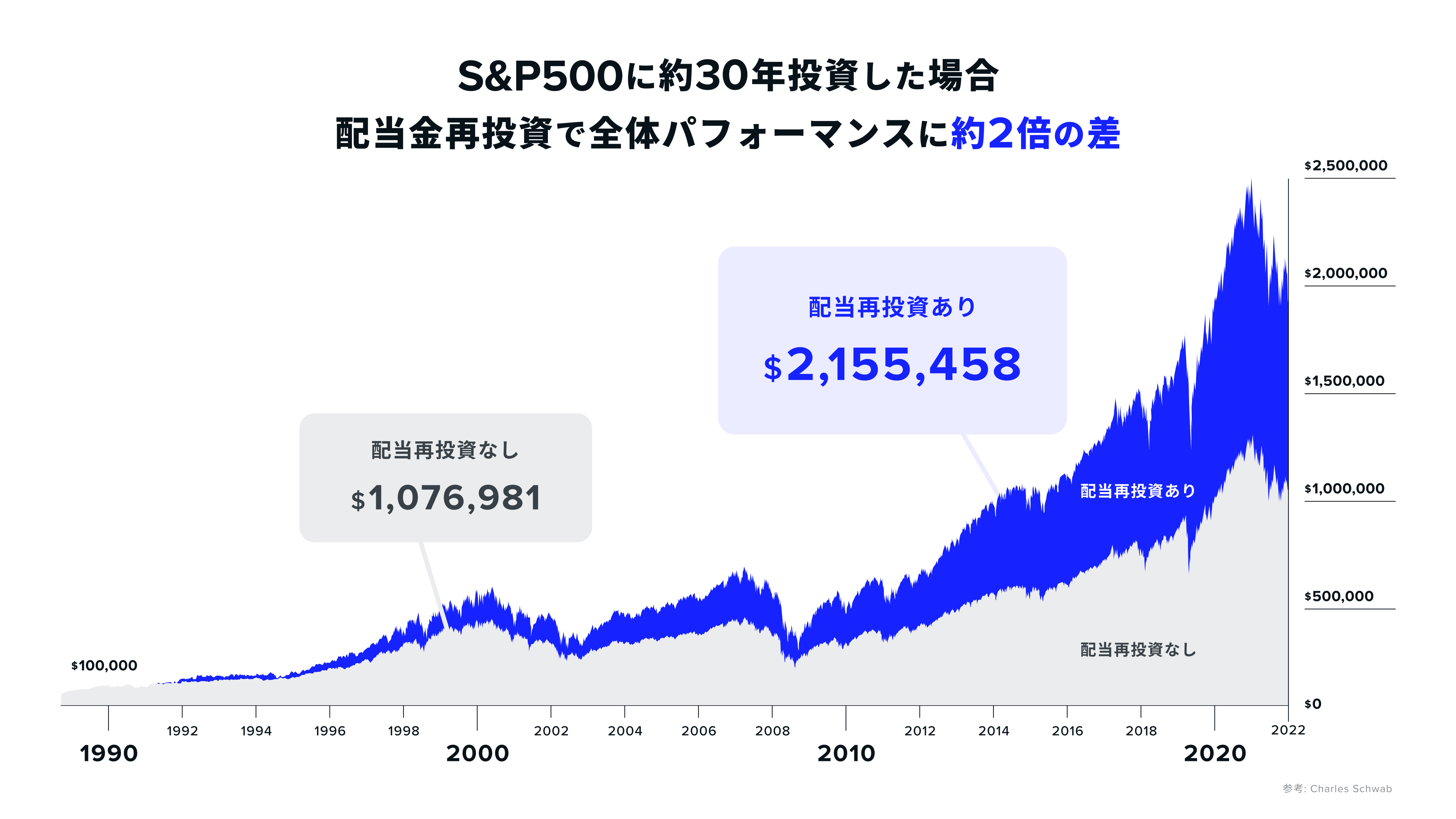 例えば、S&P500のインデックスに対して1990年に10万ドルを投資した場合、配当金を再投資し続けていれば2022年末には210万ドルまで増えるのに対して、配当金を再投資しない場合は110万ドルにしかならず、全体パフォーマンスに2倍の差がつくという計算結果も出ています。