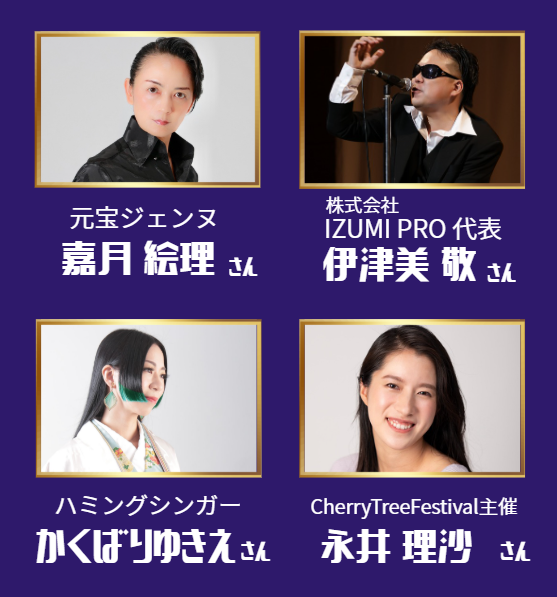 元宝塚歌劇団の嘉月絵里、株式会社IZUMI PRO代表の伊津美敬、CherryTreeFestival主催の永井理沙が審査員として参加。ハミングシンガーとして世界的に活躍するかくばりゆきえも審査員として加わります。