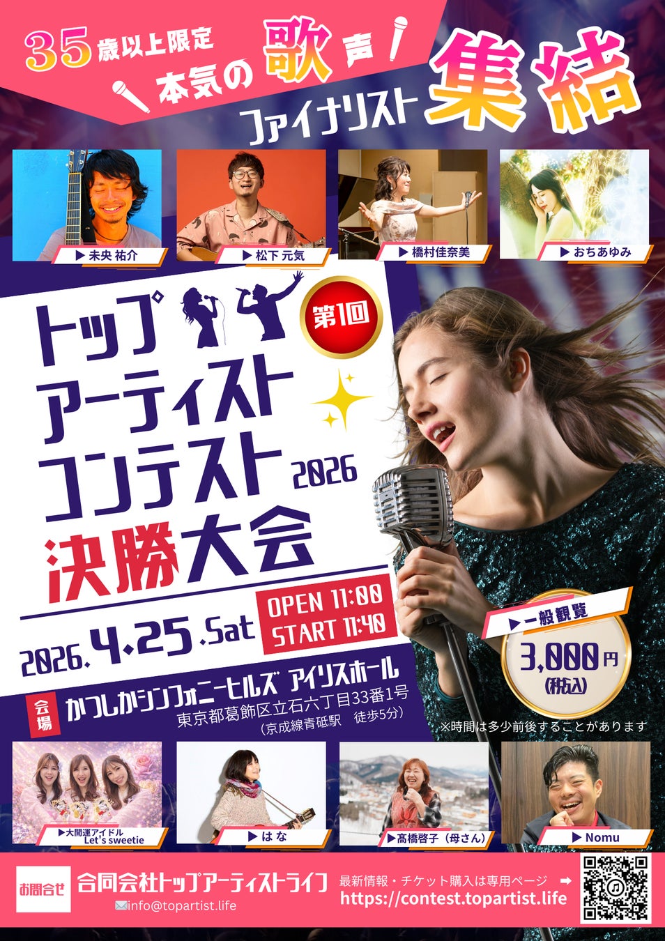 2026年4月25日(土)、35歳以上のシンガー限定の音楽イベント「トップアーティストコンテスト2026」決勝大会が東京都葛飾区にて開催されます。