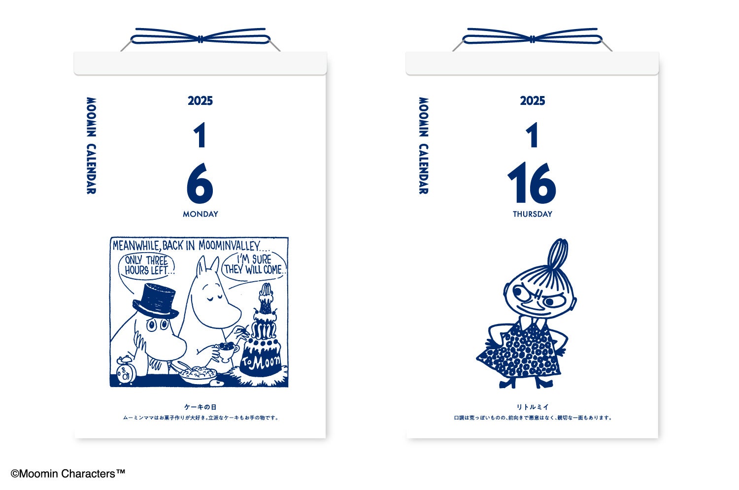 ムーミン・コミックスのアートが365日楽しめる「日めくりカレンダー」と、コースターのような厚みのある紙がかわいい「卓上カレンダー」。どちらもムーミンの世界を楽しみながら1年間を過ごせる、贈り物にもぴったりのカレンダーです。