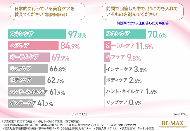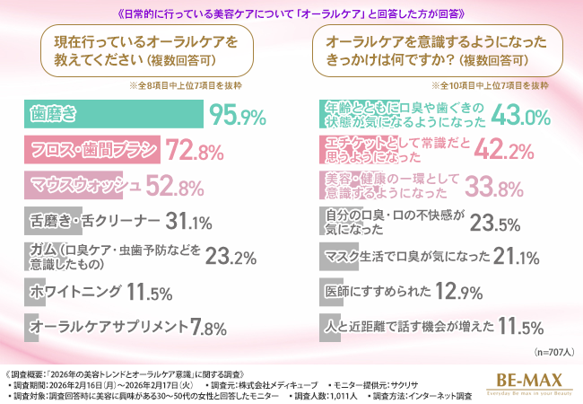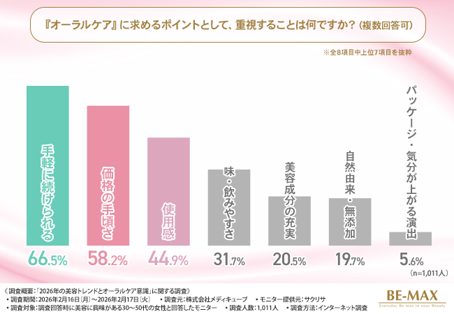 そこで今回、口内から整える夜のインナーケア『BE-MAX BRM PASTE 5000(ベルム ペースト ゴセン)』を販売する株式会社メディキューブ(https://www.be-max.info/)は、美容に興味がある30~50代の女性を対象に、「2026年の美容トレンドとオーラルケア意識」に関する調査を実施しました。