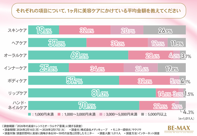 「スキンケア」には約4人に1人が月に『5,000円以上』を費やしているのに対し、「オーラルケア」は『1,000円未満』で済ませる方が6割以上を占めています。