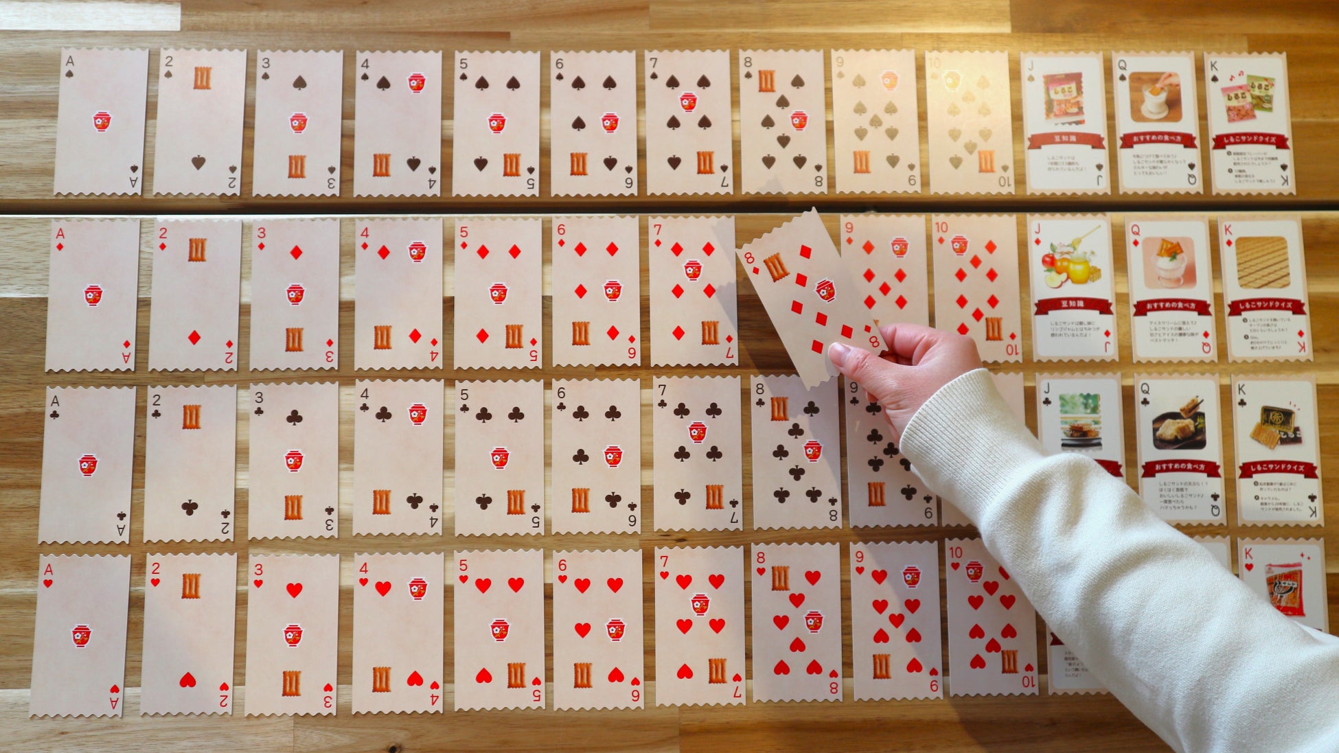 今回の景品である「しるこサンドトランプ」は、しるこサンドをモチーフにしたオリジナルデザインとなっており、1~10のカードには、小さなしるこサンドや赤いお椀が散りばめられており、並べたときのデザインも楽しめる仕様に仕上げました。