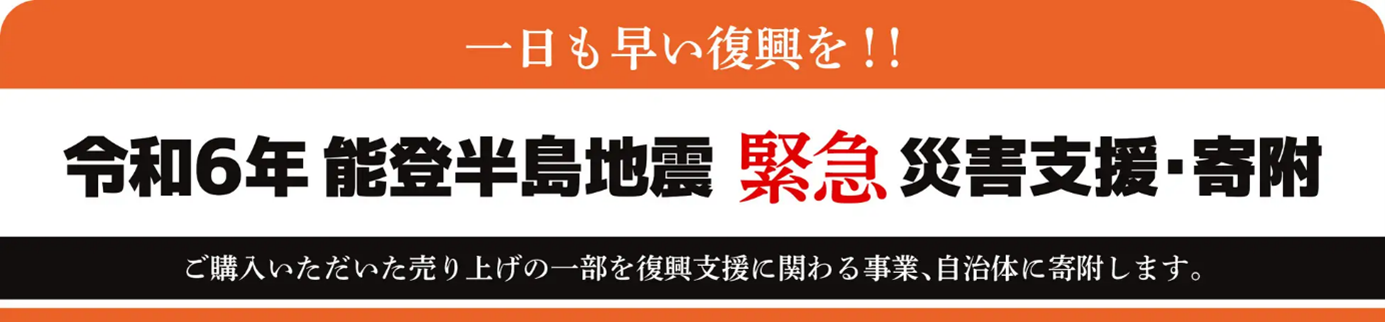 この取り組みは、大津屋が運営する「オレンジBOX」「オレボステーション」「福人喜」並びに、受託運営する福井市観光物産館「福福館」の計12店舗にてご購入いただいた売上の一部(0.1%)を、令和6年能登半島地震被災地の復興支援に関わる事業、自治体に寄付するものです。