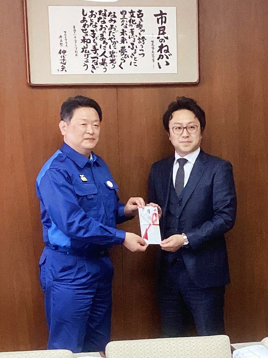 茶谷義隆七尾市長に目録を贈呈する小川社長