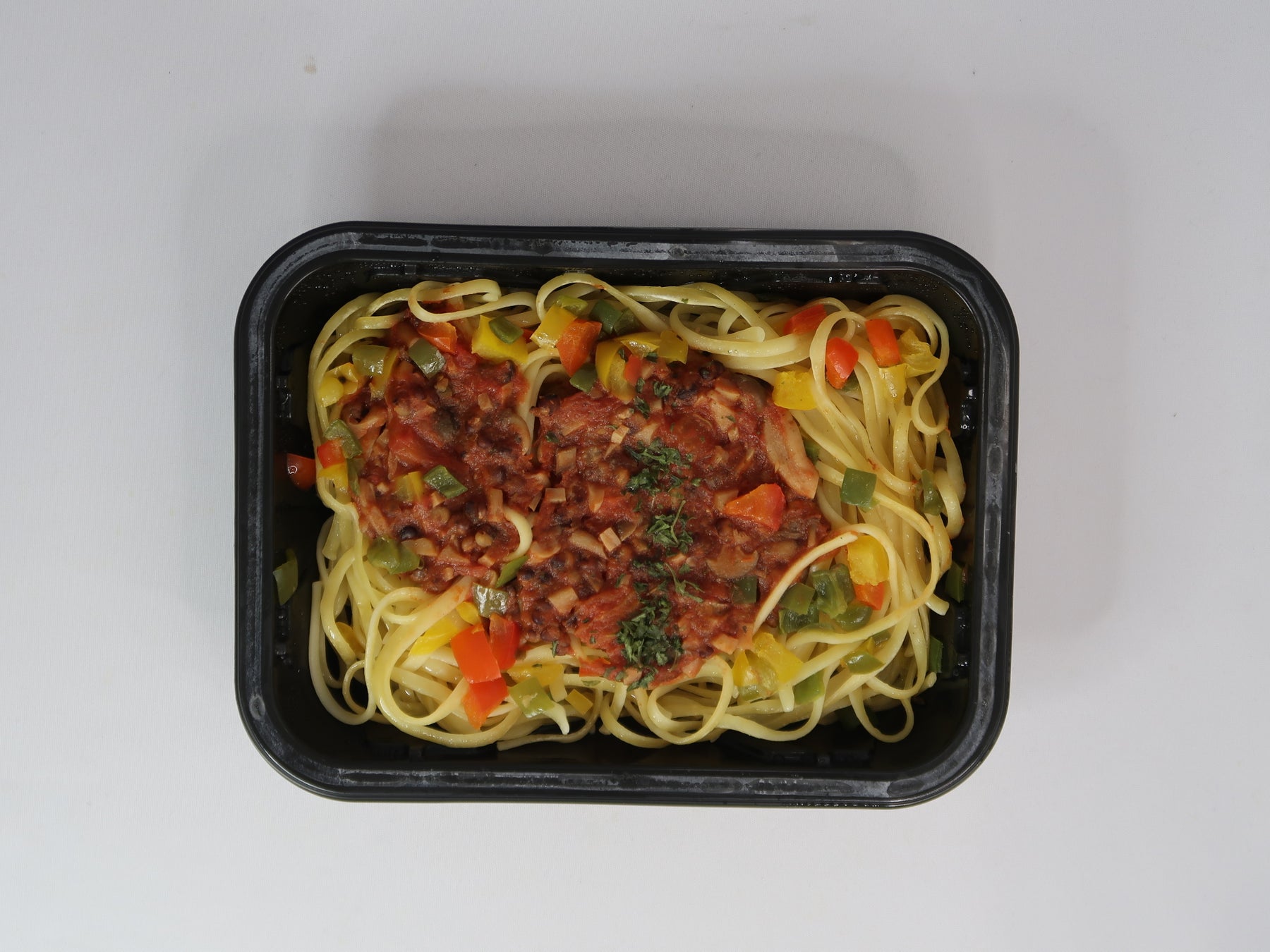 彩り野菜(赤・黄パプリカ、ピーマン)がアクセントとなり、目にも鮮やかで満足感たっぷりのプラントベース・パスタです。