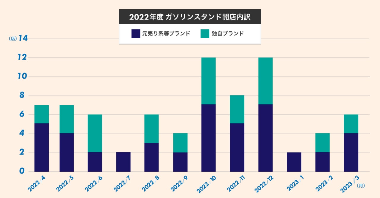 2022年度に開店したガソリンスタンドを、元売り系などのブランド と 独自ブランドに分けて店舗数を比較。