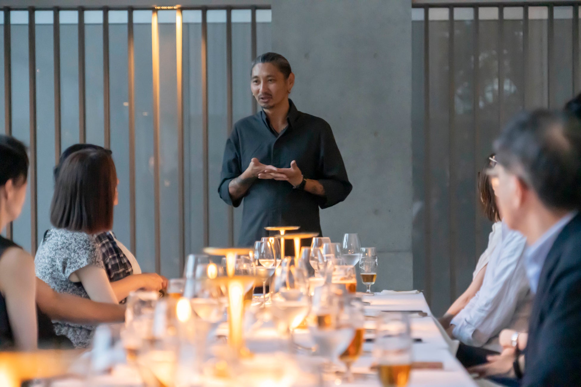 料理ごとに永島シェフが背景にあるストーリーを紹介する演出も加わり、参加者は「伝統と革新」を贅沢に体現した料理と空間を堪能しました。永島シェフは「サントリーやレストランがボーダーを超えて、ここでしか体験できないことを作り、お客さんと共有する」と熱意をもって取り組まれました。