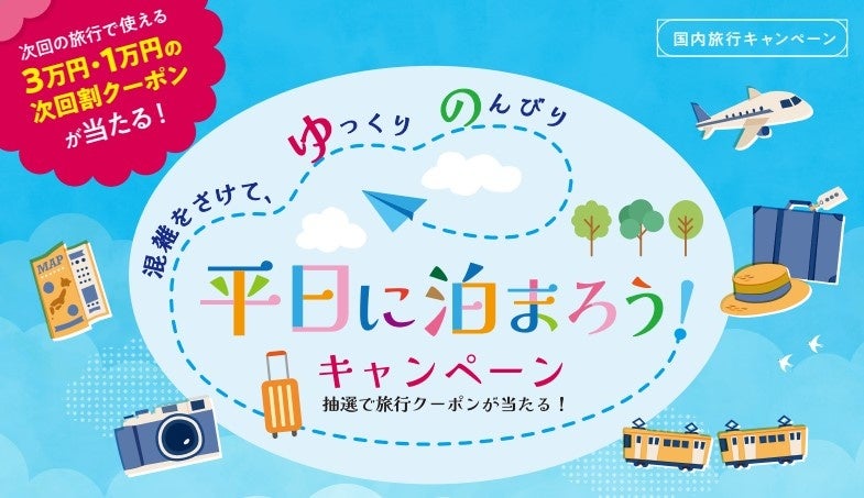 本キャンペーンは、平日旅行(平日に宿泊)に特化したキャンペーンとして、平日に宿泊したお客様に抽選で次回のご旅行に使えるクーポンが当たるという内容です。業界全体で一体となり、このキャンペーンを展開していくことで、混雑緩和や需要の平準化はもとより、国を挙げての休暇取得促進や自治体での各種取り組み(ラーケーション、休み方改革等)と連動した休暇取得促進のムーブメントを醸成してまいります。