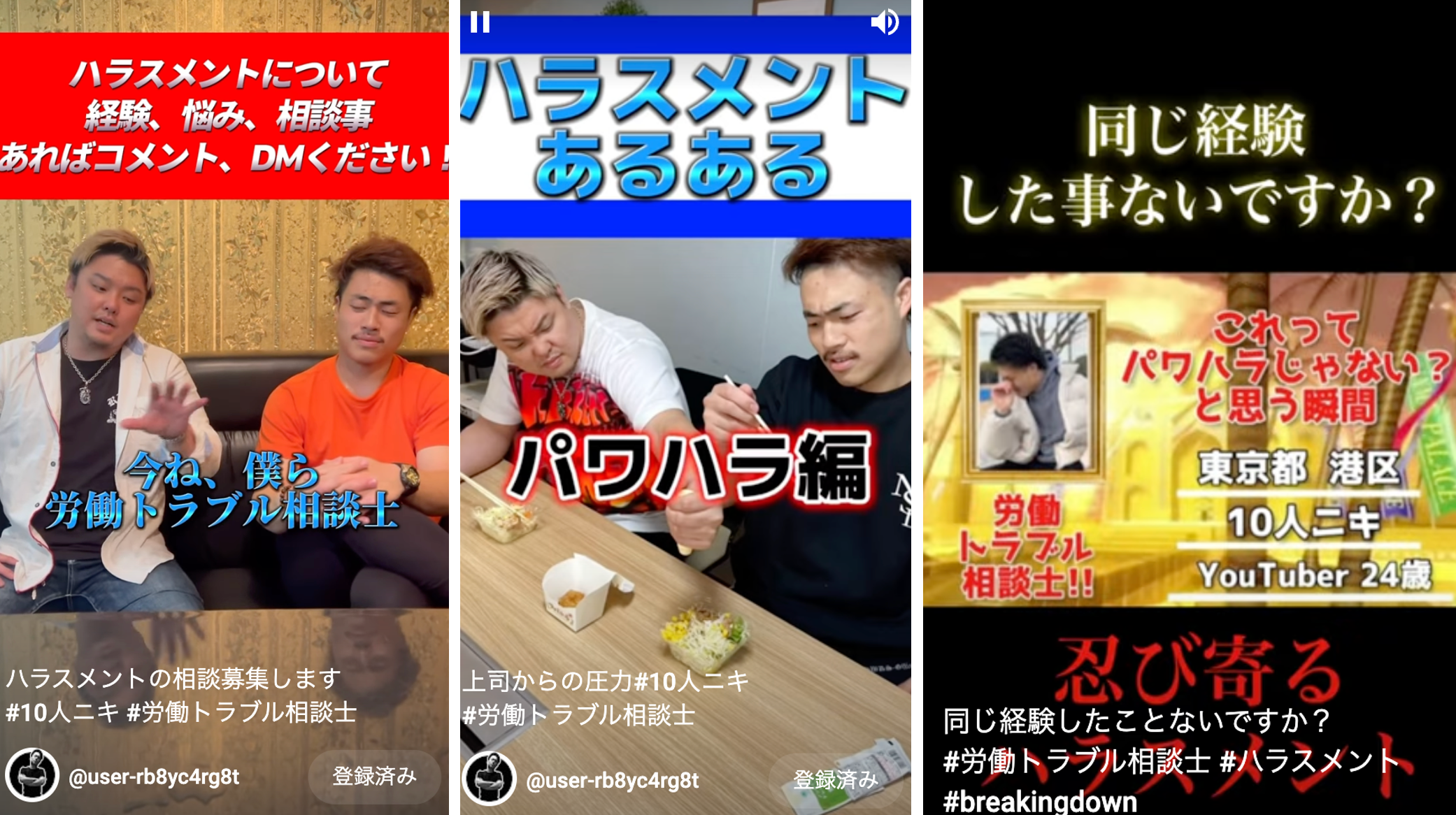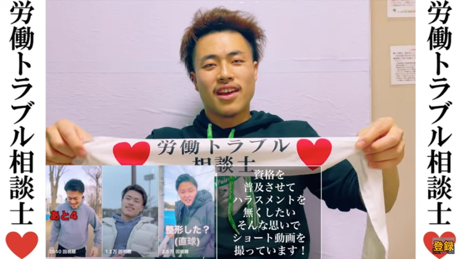 「ハラスメントをなくす」という社会的テーマに賛同し、労働トラブル相談士としての活動を始めたにっけん君とのコラボ動画は、本人のリアルな体験を経て作られています。週6勤務、10時間労働、手取り15万円の会社に勤め、電気工事士の世界にもあったハラスメント体験を元にユーモアに富んだ作品を紹介してくれています。