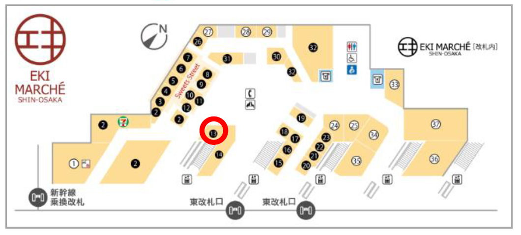 場所:エキマルシェ新大阪(改札内)区画番号⑬(下図参照)