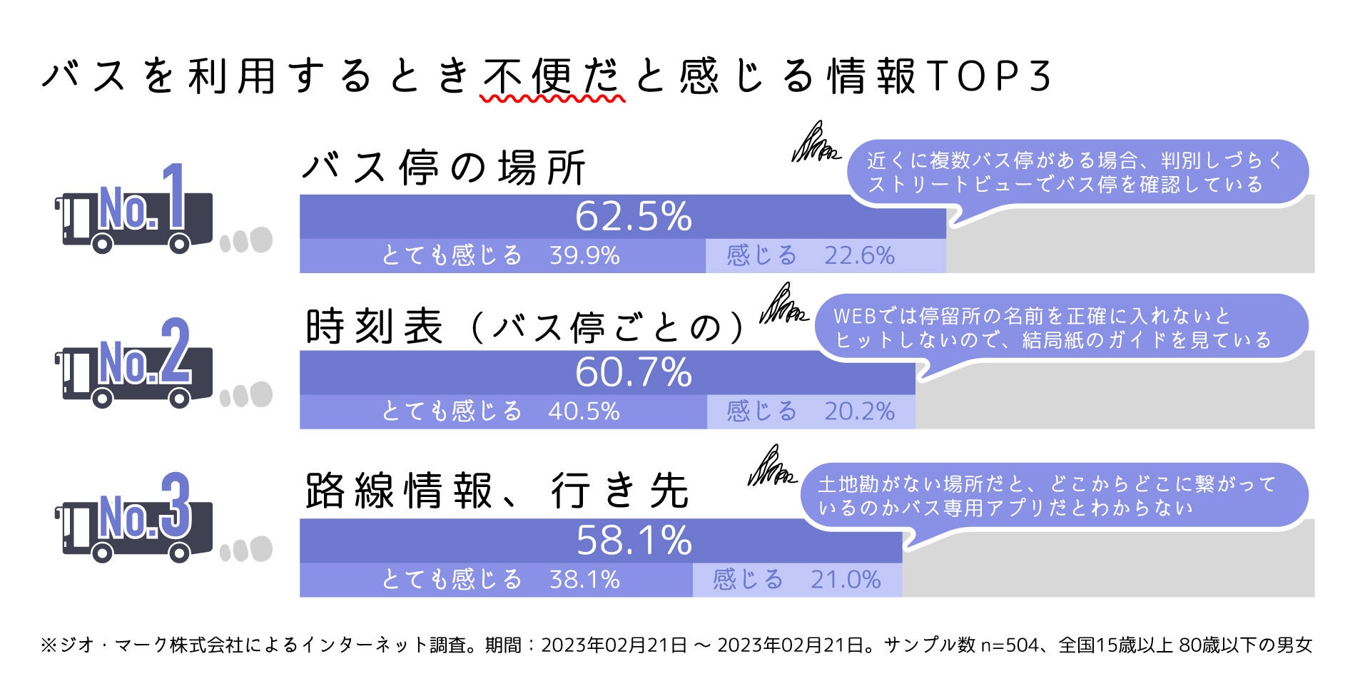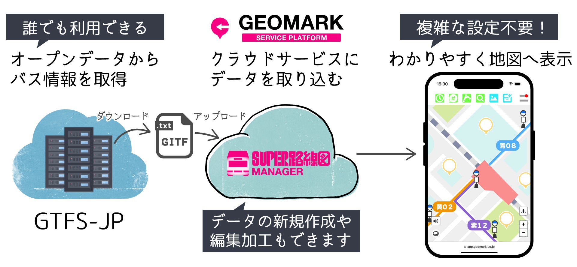 ジオ・マーク株式会社(所在地:東京都文京区、代表:岡崎 峻二郎)は"地図で移動と体験を最高に"をビジョンに、これまでクラウドテクノロジーで高機能な地図を作ることができる独自のサービスを展開してきました。その過程で、人々の移動の要であるバス情報が分かりにくいという往年の問題が課題となりました。弊社はこの課題に応える最適解として、国土交通省が標準化を勧めるバス情報フォーマットである『GTFS-JP』データを利用し、クラウドシステムに登録するだけで、地図上にDX化されたバス路線図を表示できる『SUPER路線図』を開発しました。本サービスは2024年9月ローンチ予定です。