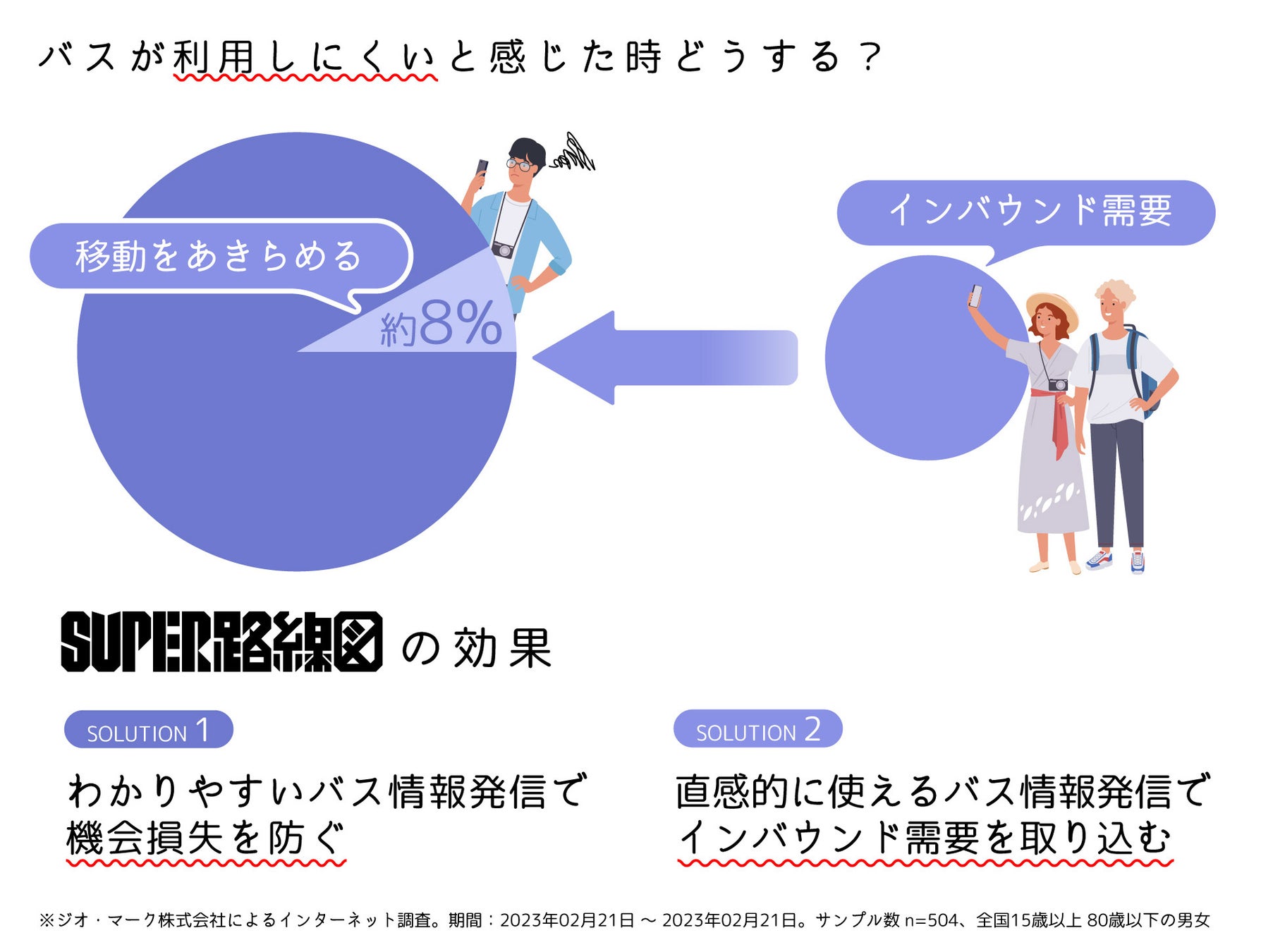 弊社で培われた地図表示技術から生成される直感的でわかりやすい地図表示システムによって利用者が簡単にバス情報を取得できるため、昨今深刻化する公共交通の利用者減少による都市機能の維持に関わる課題が解決できる可能性があります。弊社で実施したインターネット調査ではバス情報のわかりにくさに起因する利用控えで約8%の機会損失が発生してい流ことがわかっています。『SUPER路線図』はそういった課題を解決し、さらに拡大するインバウンド需要に対しても、バスを利用しやすい環境を提供することでさらにバス利用者を拡大します。