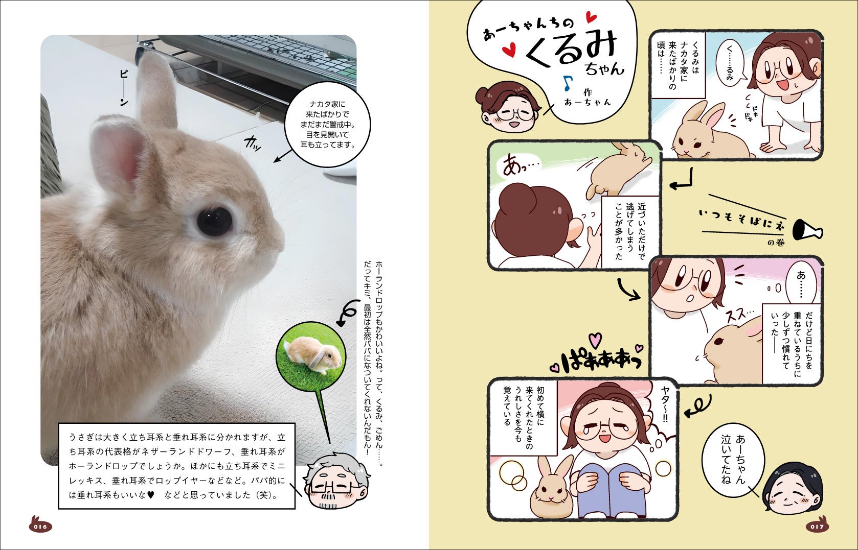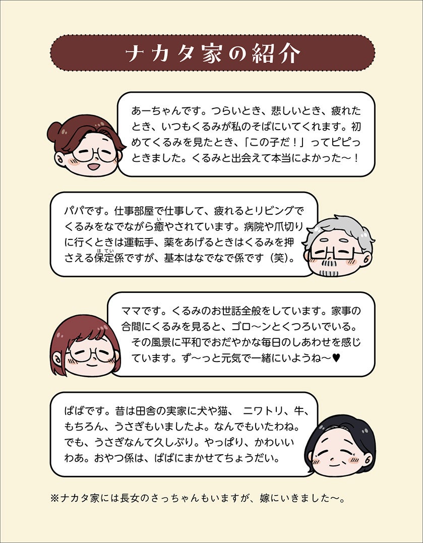 2015年3月、次女あーちゃんの中学校進学を機に、ナカタ家でうさぎとの共生が始まりました。家で生き物を育てるのは初めてのこと。ましてや、うさぎの知識はまるでありません。うさぎのお迎え、行動スペースづくり、しつけ、食事、病気……さまざまな課題をクリアしながら、やがてうさぎとの楽しくしあわせな共生生活を実現。オレンジ色をしたネザーランドドワーフの女の子「くるみちゃん」も家族のみんなに心を開き、10年の歳月をかけて少しずつナカタ家の一員になっていくのでした。※本記事の紹介画像は著作権フリー。転載、拡散可。