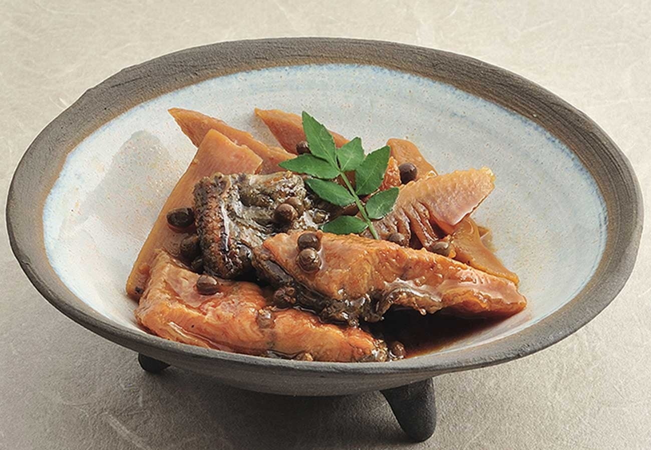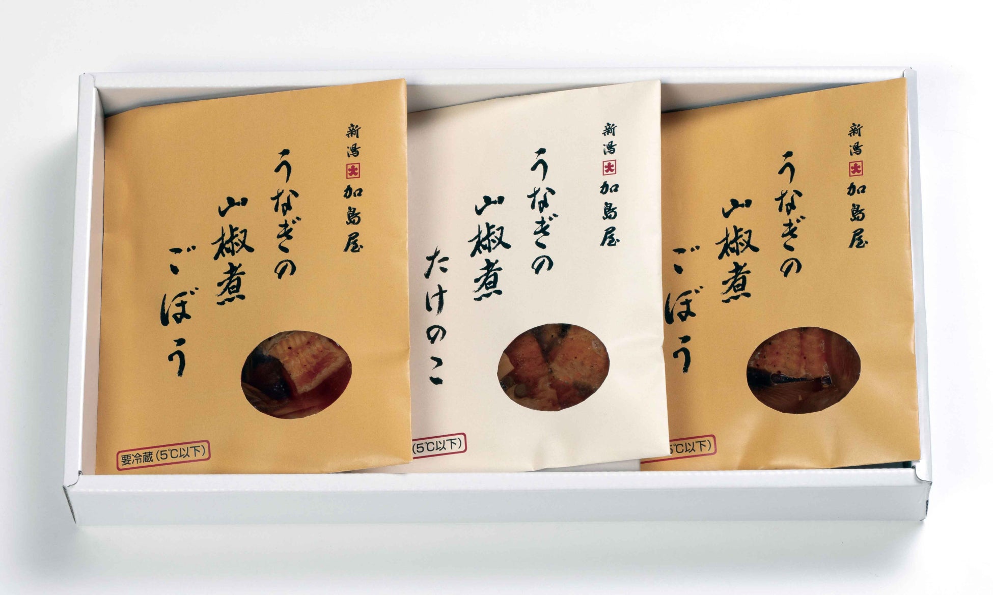 うなぎと言えば、蒲焼きを思い浮かべる方が多いと思いますが、加島屋は、加島屋が得意とする「魚を煮る・炊く技術」を活かして、山椒煮にしました。山椒はパウダーではなく実を使い、噛んだ時の歯ごたえと香りを存分にお楽しみいただけます。また、うなぎを引き立てる名脇役として、ごぼうとたけのこの2種をご用意。食感の違いもお楽しみください。