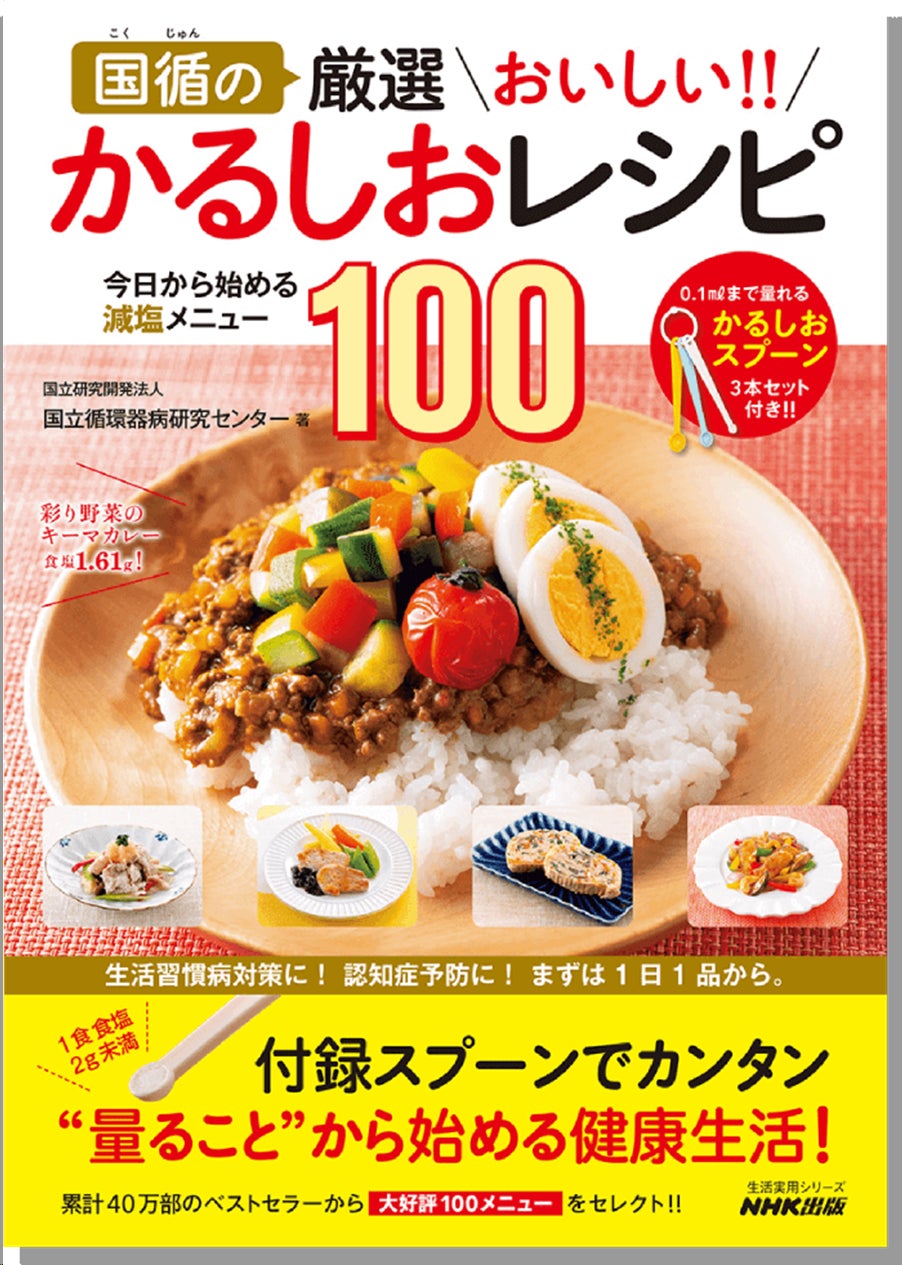 そこで、国循では減塩による循環器病予防啓発の取り組みの一環として、「かるく塩を使っておいしさを引き出す」という「かるしお」調理法の開発・普及に取り組んでいます。国循で開発された「かるしおレシピ」の書籍は、単なるレシピ本としてだけではなく循環器病予防における減塩の重要性を啓発する役割を担っています。