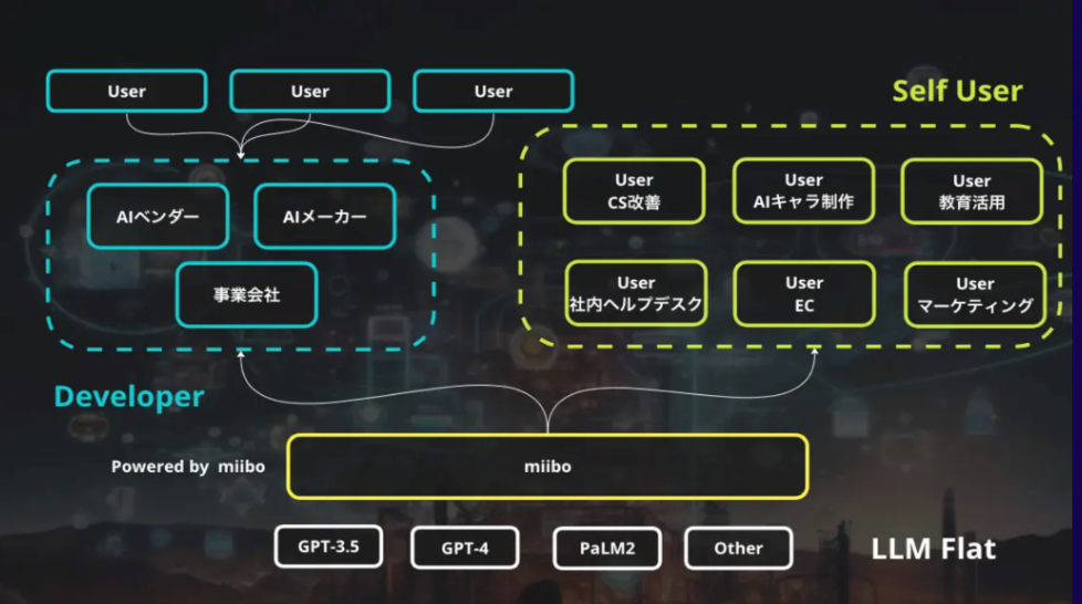 miiboで開発するAIは、あらゆるサービスやユーザーインターフェース、LLMとのハブとして機能します。チャットボットに限らず、会話型AIは社会のあらゆるインターフェースを介して今後ユーザーに提供されます。ユーザーインターフェースと様々なアプリケーションやLLMを接続するハブとしてのAIを提供することで、あらゆるユースケースに対応します。