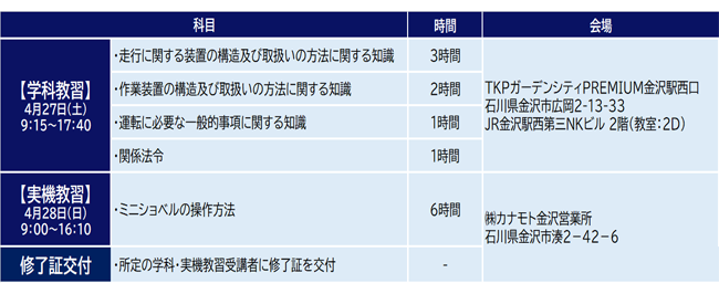 当社(株式会社加藤製作所/本社:東京都品川区)は、株式会社カナモト(本社:北海道札幌市、以下「カナモト」)協力のもと事業を通じた被災地支援策の一環として石川県金沢市にて地域の学生等を対象にしたショベルカーの無償教習を2024年4月27日から2日間開催いたします。