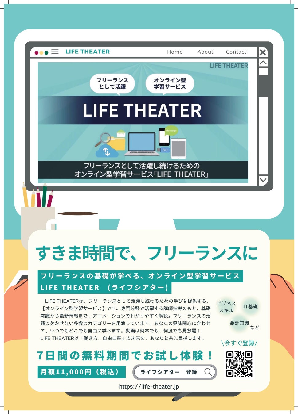 LIFE THEATER(ライフシアター)は、働き方が多様化している今の時代で、フリーランスとして活躍し続けるための学びの場所を提供する、今までにないオンライン型学習サービスです。