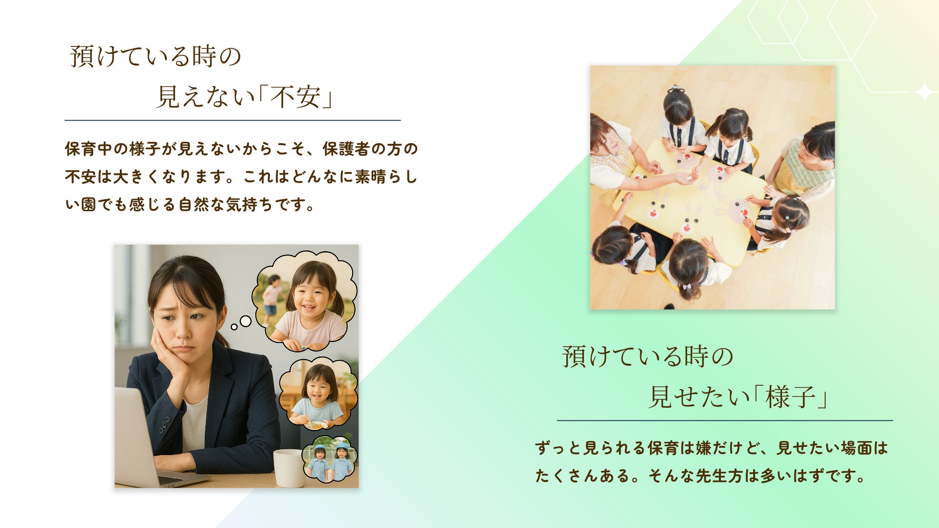 共働き世帯が当たり前となり、親が子どもと密に関われる時間は朝と夜のわずかな時間に限られています。連絡帳や写真販売では伝わりきらない、園での「見えない時間」に子どもがどのように成長し、友達と関わっているのかを知りたい。これは、多くの働く親が抱える切実な願いです。