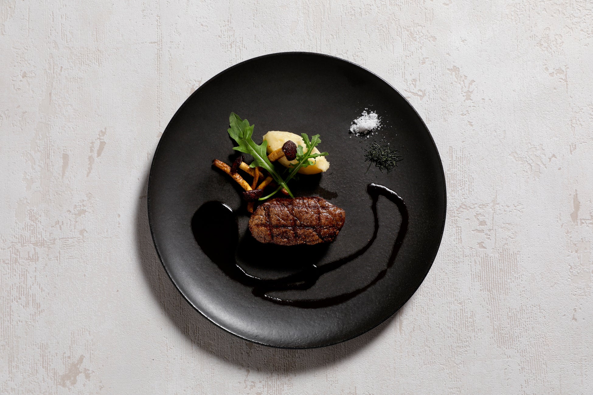 八女茶で香ばしく燻製した後にローストすることで、一味違う味わいに仕上げた博多和牛フィレ。福岡県・田主丸の巨峰ワインで作った赤ワインソースと、シャキシャキした食感が魅力の希少なきのこ「博多すぎたけ」を添えて。