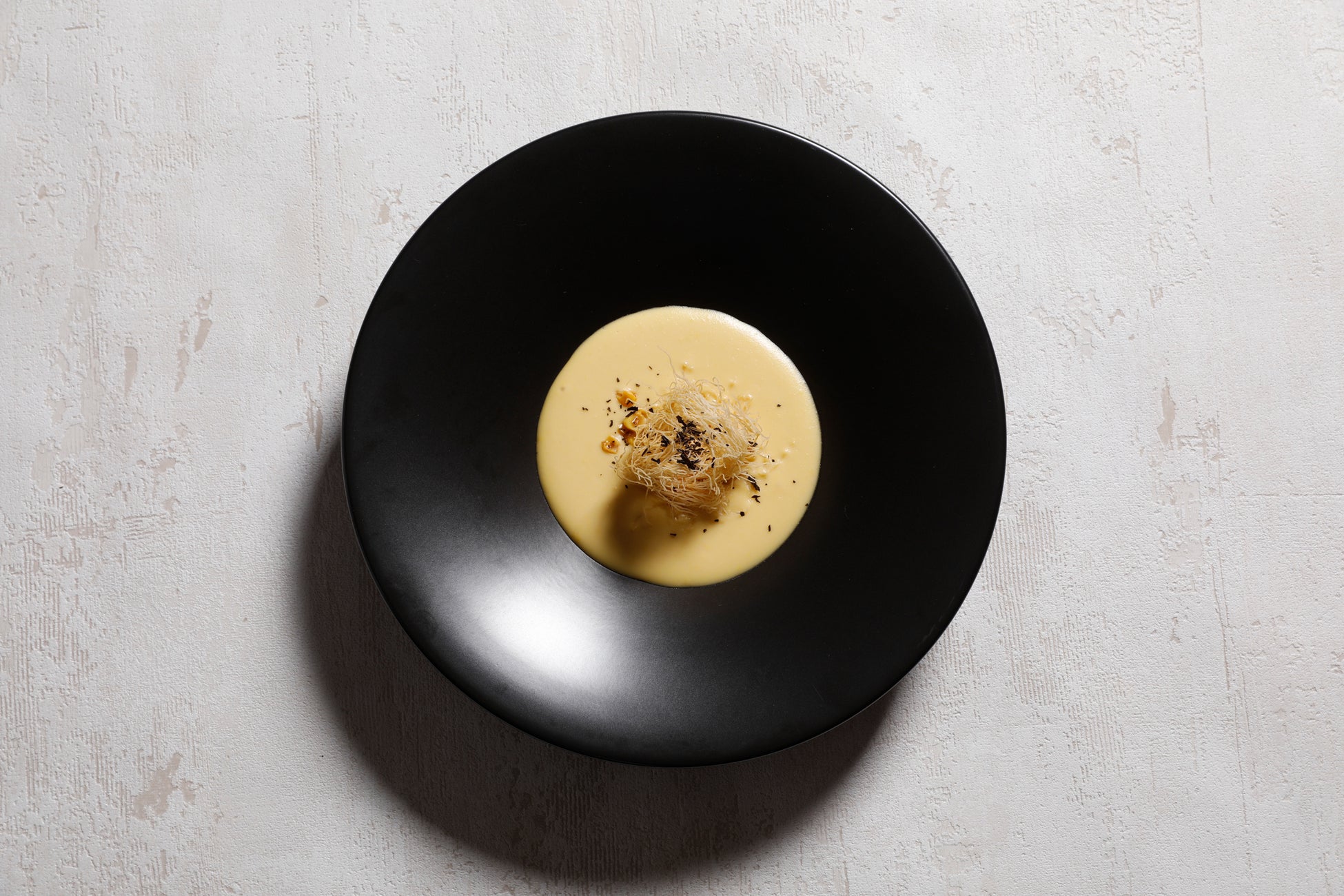じっくり炒めて甘味を引き出した福岡県産とうもろこしと、香ばしい八女ほうじ茶の香りのマリアージュが楽しいスープ。濃厚でありながら後味すっきり。