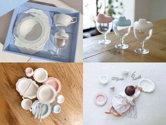 使いやすさや子育ての負担軽減を考えたデザイン設計で、電子レンジや食洗機が利用できるほか、転倒防止の滑り止めやグラス付属の乳幼児向け飲み口など、機能性も抜群です。