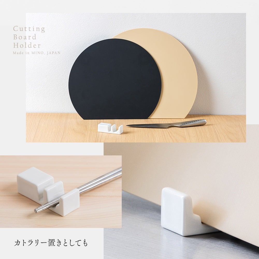 美濃焼のまな板・カッティングボード置き。やさしい風合いの陶器製で、汚れても洗いやすく清潔に保てます。※本品だけでは自立しないため、必ず壁に立て掛けて使用してください。