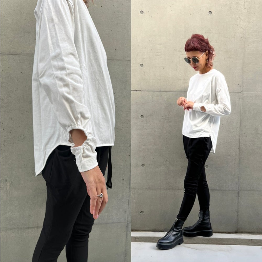 秋口に活躍しそうなロングTシャツ。シャーリング加工の穴のアクセントが袖にあしらわれています。1枚ではもちろん、ニットなどとレイヤードスタイルもおすすめです。