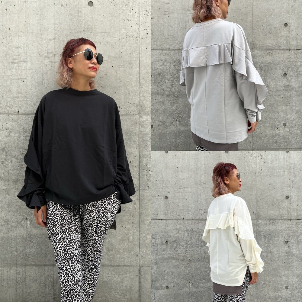 袖から反対側の袖に向かって、大きなフリルをデザイン。Tシャツとスウェットの中間とも言える、程よい厚手の素材を使用し、長めの着丈でチュニック感覚で楽しめます。