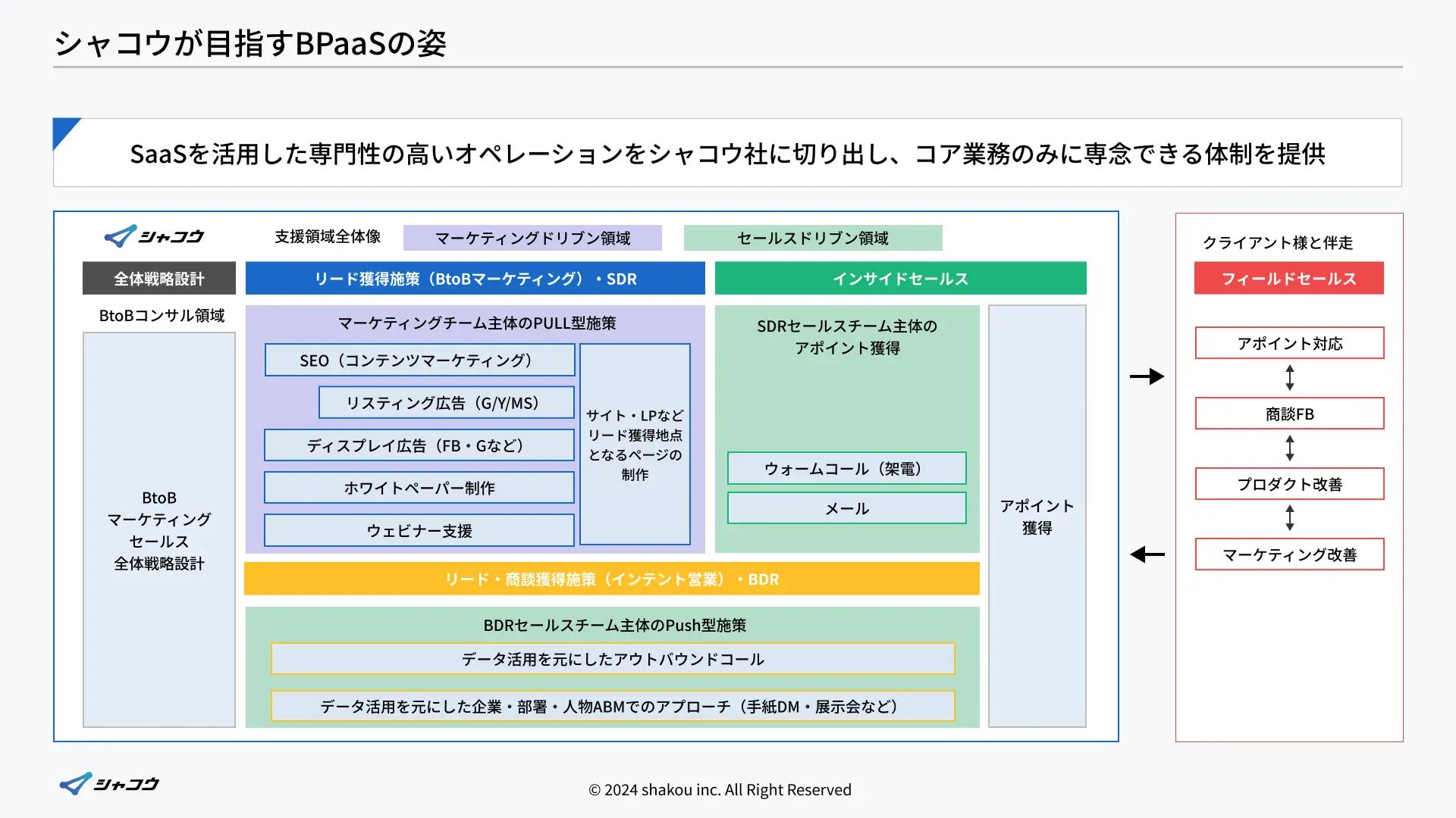 上述の時代背景から高度化するBtoBマーケティング・セールスの施策選びから実務遂行までのオペレーション一式を切り出し、顧客と向き合いサービス/プロダクトを改善するという本質的な部分にクライアント様が向き合える体制を作ることを目指しています。BtoB企業支援に特化しBtoBの定石と言えるメソッドを蓄積してきたシャコウ社だからこそできる再現性のある支援で本質的な伴走支援を行います。
