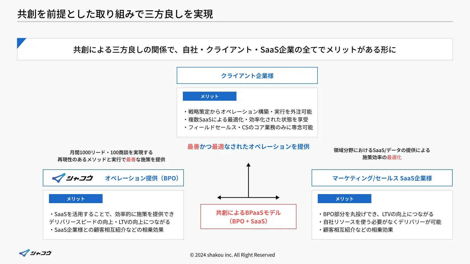 SaaS/データ/ノウハウの最適な活用方法とメソッドと実務遂行をシャコウ社で行うことで、クライアント様は「最善な施策」を「最適な方法」で実施された結果を享受できる形となり、クライアント様・SaaS企業様・弊社の三方よしの関係が成り立ちます。