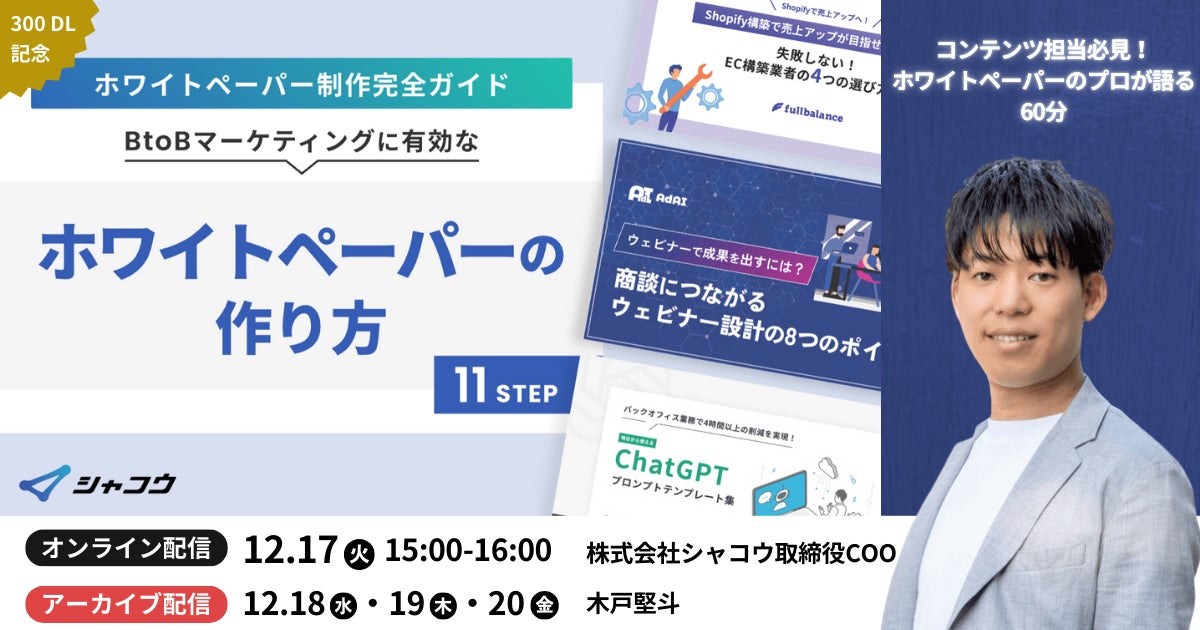 シャコウ社ではこれまで、BtoBマーケティング・ホワイトペーパー領域におけるメソッドの発信活動を積極的に行ってまいりました。特にホワイトペーパーマーケティングは、リード獲得・ナーチャリング施策全体の「企画・ディレクション」、ストーリーライティング・デザインの「制作実務」、商談獲得につなげる「インサイドセールス」とBtoBマーケティングの中でも複数にまたがる部署のシームレスな実務実行が求められる難易度の高い施策となっております。