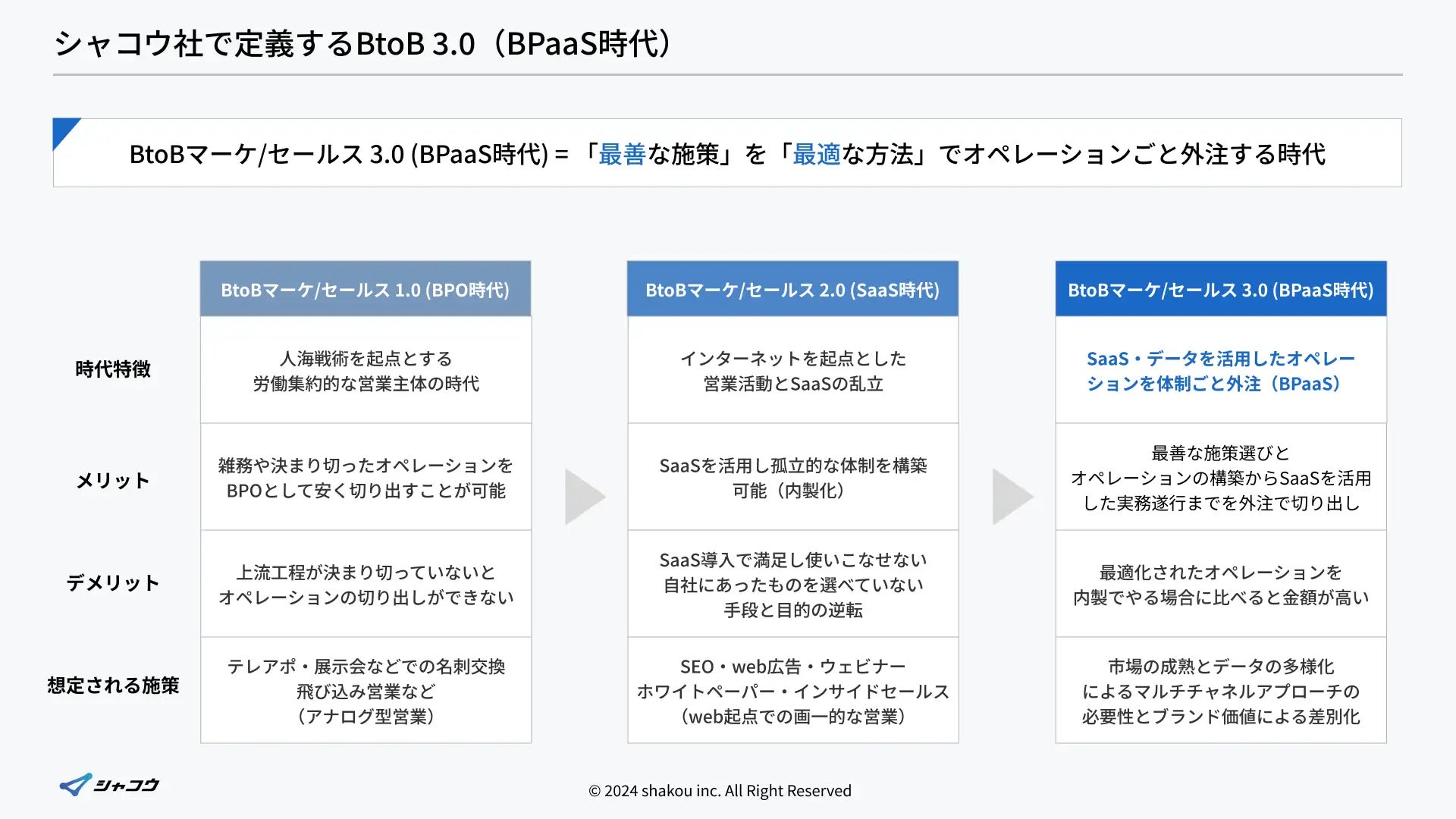 シャコウ社では、BtoBマーケティング・セールスの潮流が、労働集約的な営業主体のBtoB 1.0(BPO時代)からデータ活用・施策効率化を推進するSaaSが乱立するBtoB 2.0(SaaS時代)へ、そして「最善な施策」を「最適な方法」でオペレーションごと切り出すBtoB 3.0(BPaaS時代)と移り変っていると考えています。
