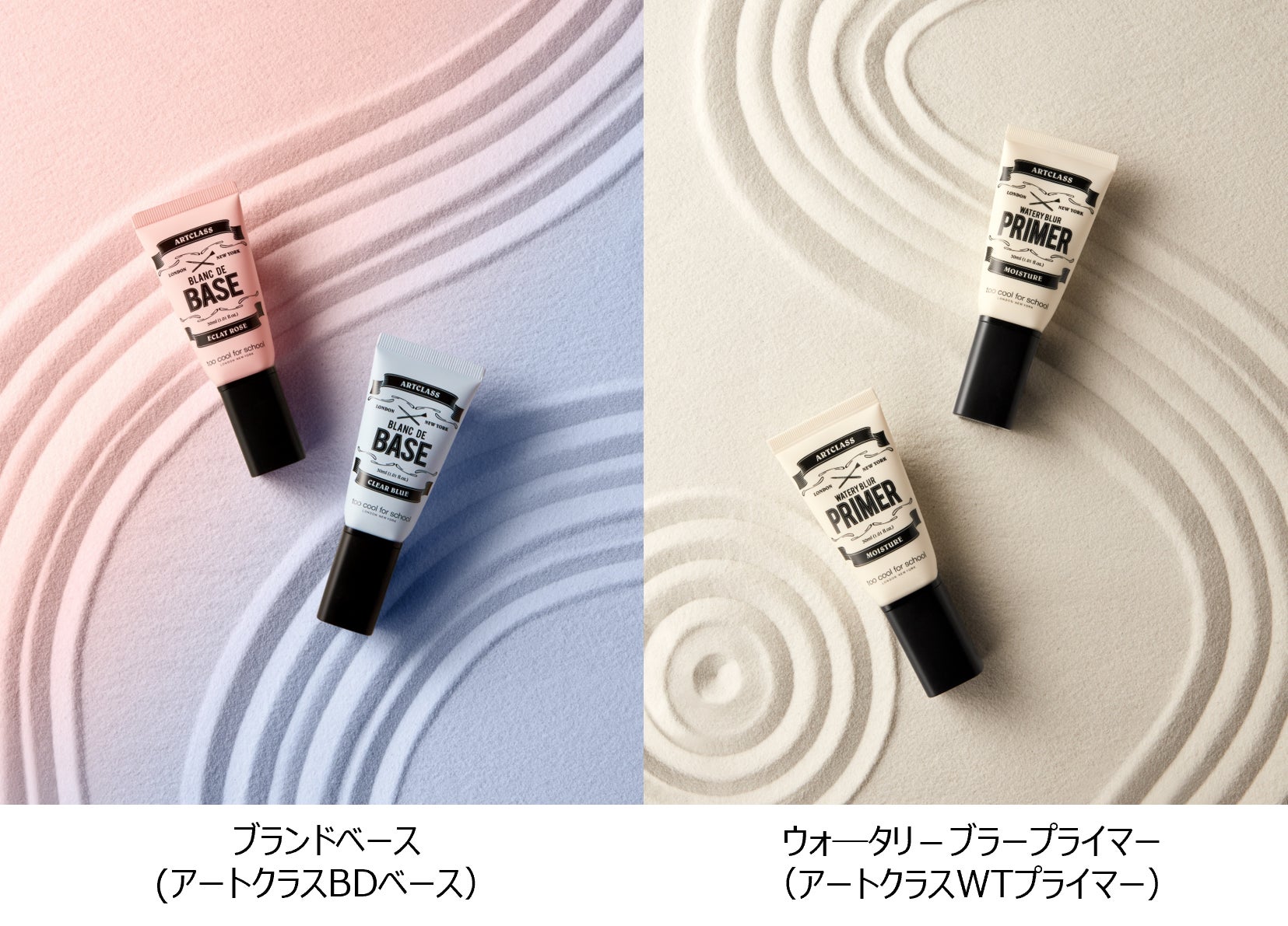 この度発売する「ウォ―タリ-ブラープライマー(アートクラスWTプライマー)」と「ブランドベース(アートクラスBDベース)」は、どちらも肌にしっかりと密着し、まるでフィルターをかけたようななめらかな美肌を叶えるのが特徴。理想の肌に合わせてお選びいただけるベースアイテムです。