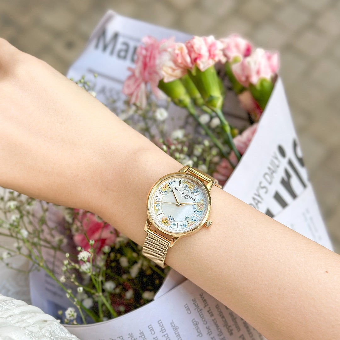 このたび発売されるのは、イギリスの伝統的な茶器のデザインからインスパイアされたティーパーティーコレクション。青と黄色の華やかなフラワープリントを文字盤に配し、ペイルイエローゴールドカラーのステンレスケースとメッシュベルトが上品な雰囲気を演出する。ケース径は小ぶりな30mmで、シーンを問わずに着用することができる。