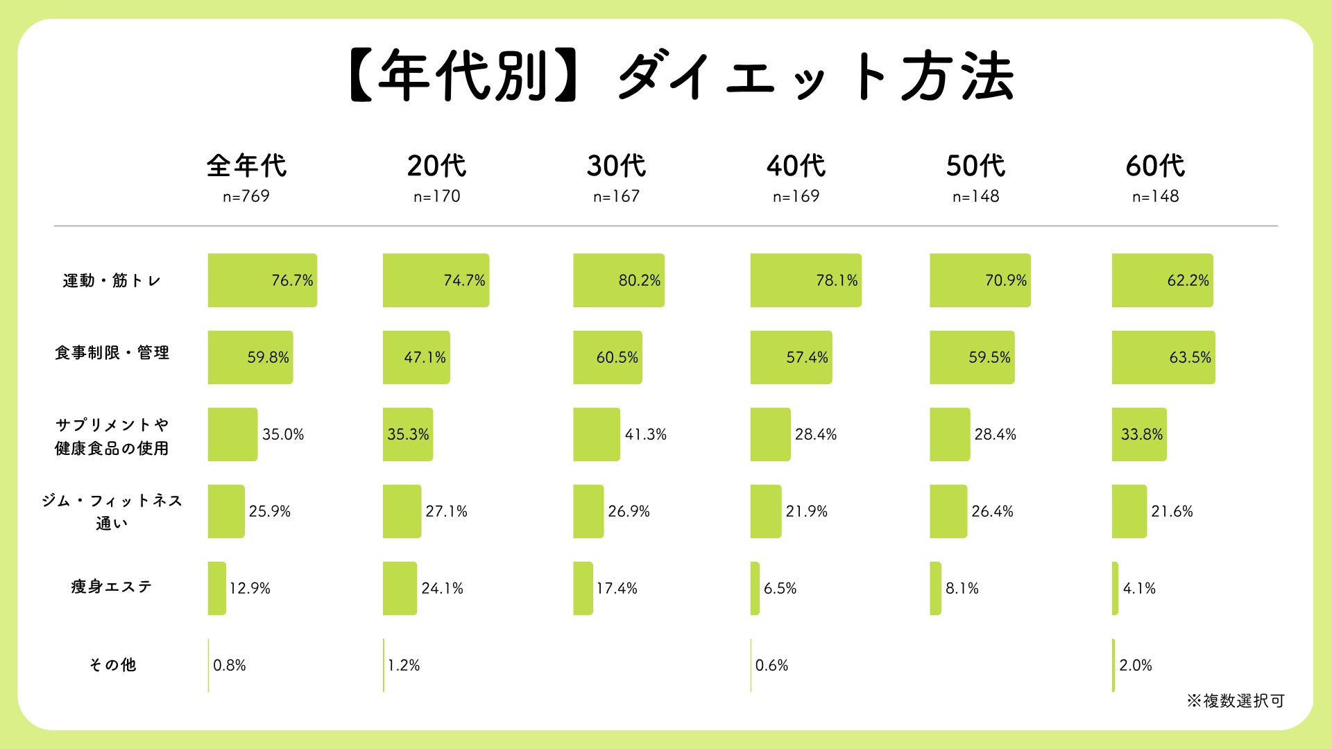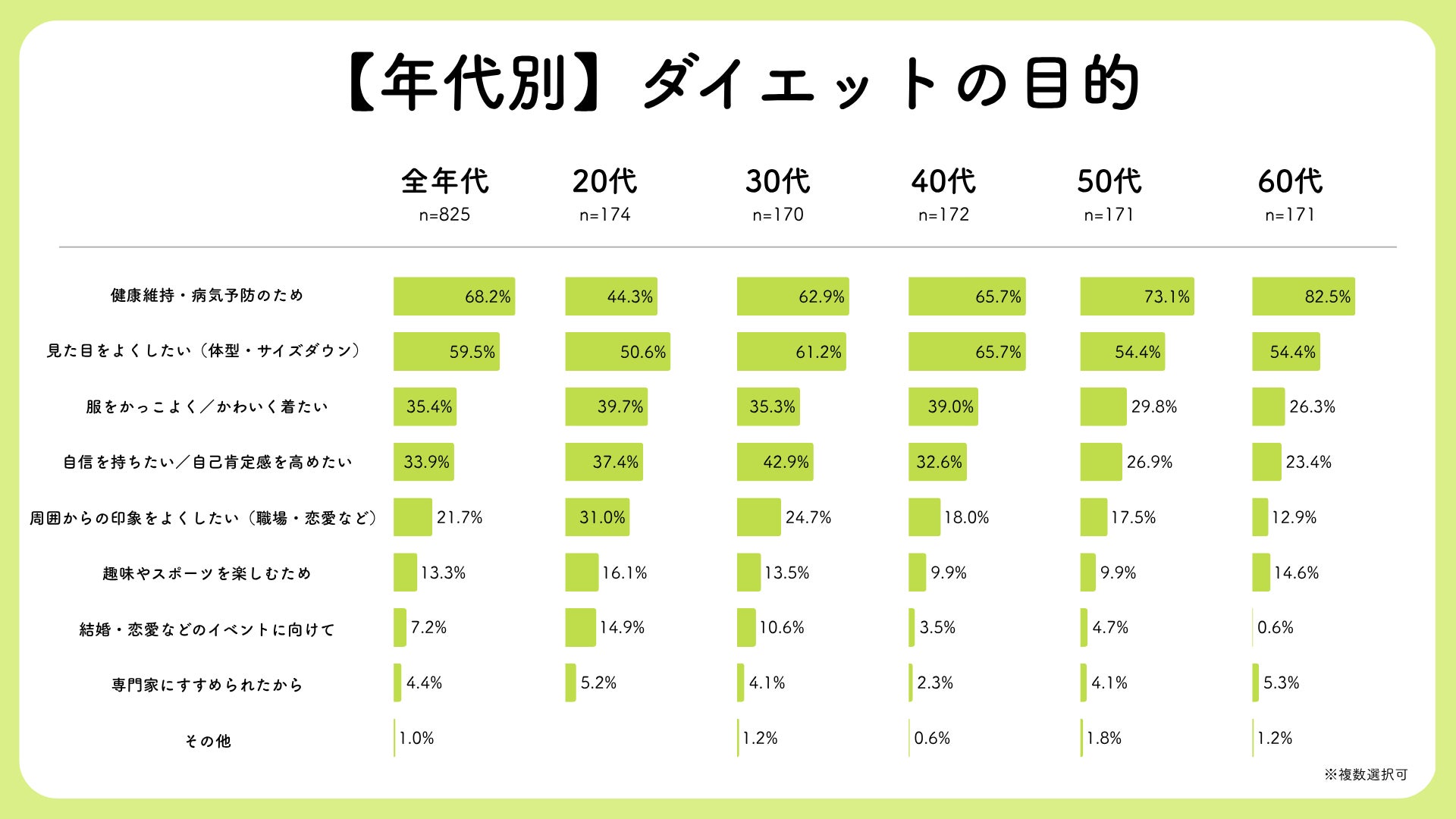 年代別に見ると、若年層は見た目志向が強く、中高年層ほど健康目的が高まる傾向。
