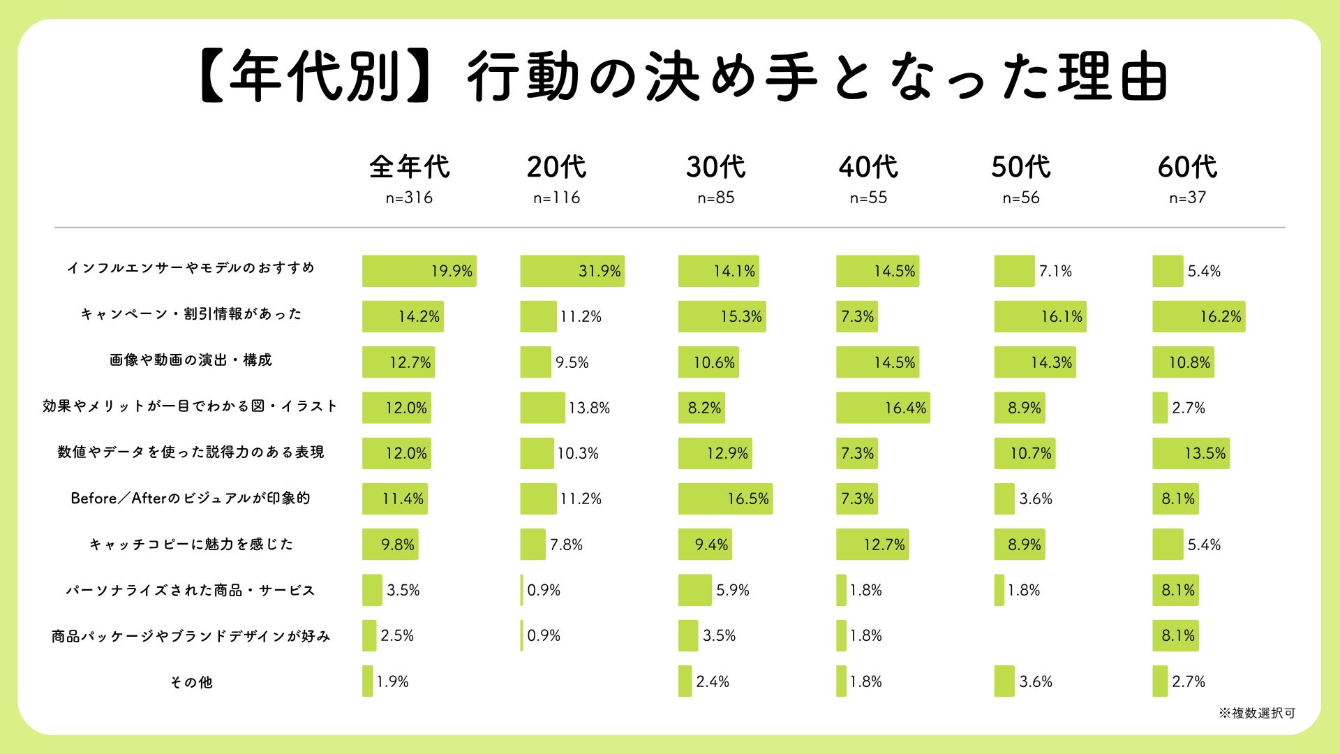 さらに年代別に見ると、20代で「インフルエンサーやモデルのおすすめ」が突出して高く(31.9%)、若年層ほど人物ベースの共感・信頼が重要視されていることがわかります。