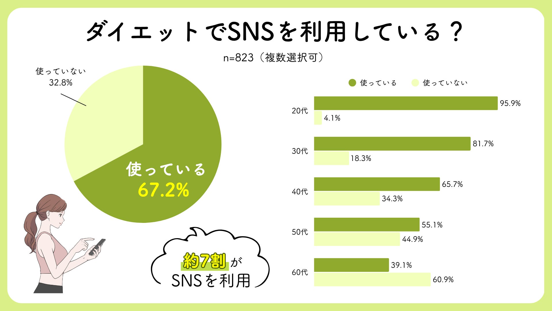 SNS閲覧者は約7割と多く、ダイエット情報の入手にはSNSが活用されている実態が見えました。