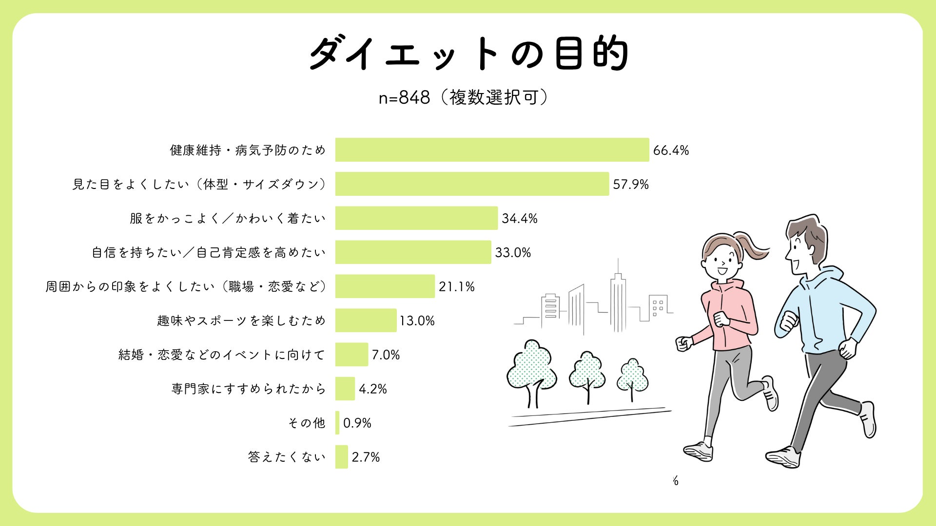 ダイエットの目的:「健康維持(66.4%)」「見た目改善(57.9%)」の二大目的が明確に。